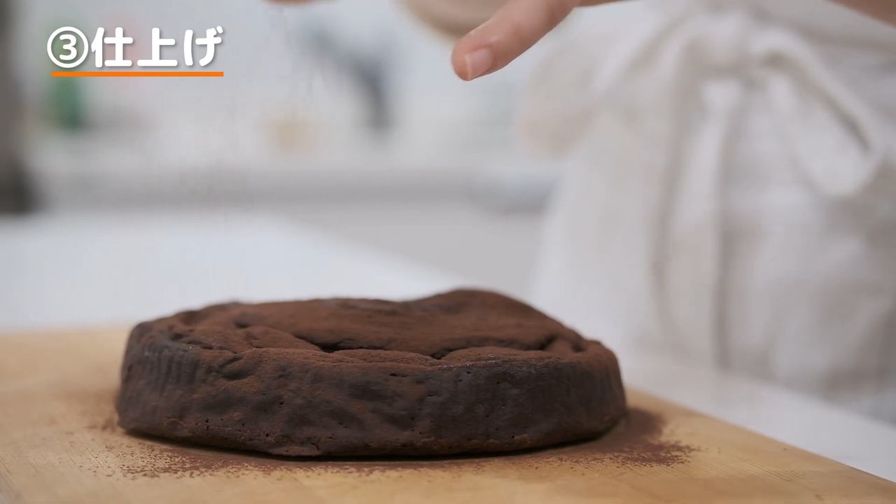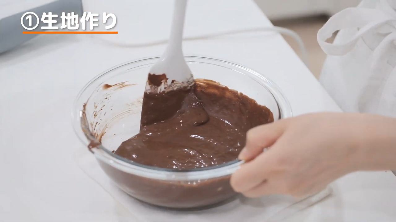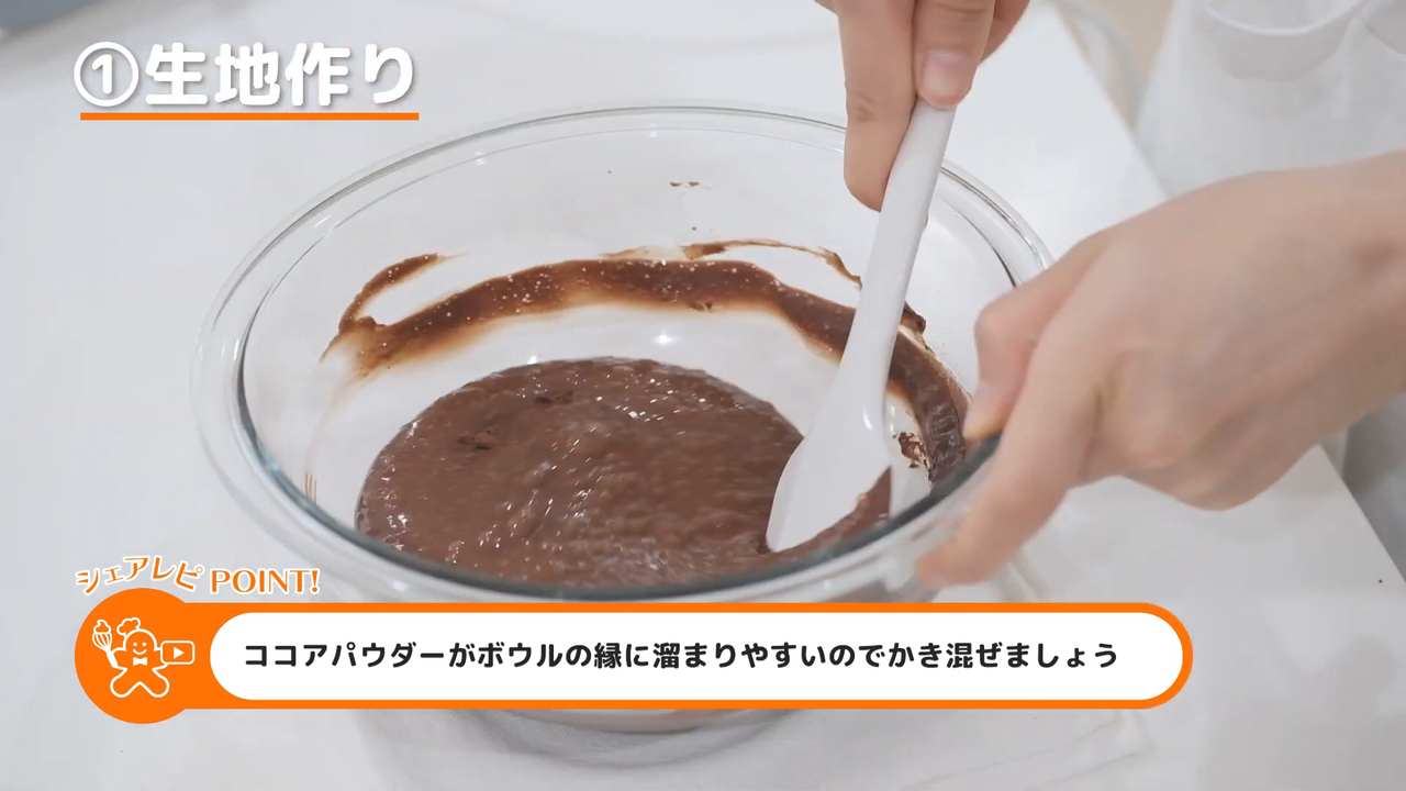 ボウルの縁に溜まったココアパウダーを取りながらゴムベラで混ぜる。- 4