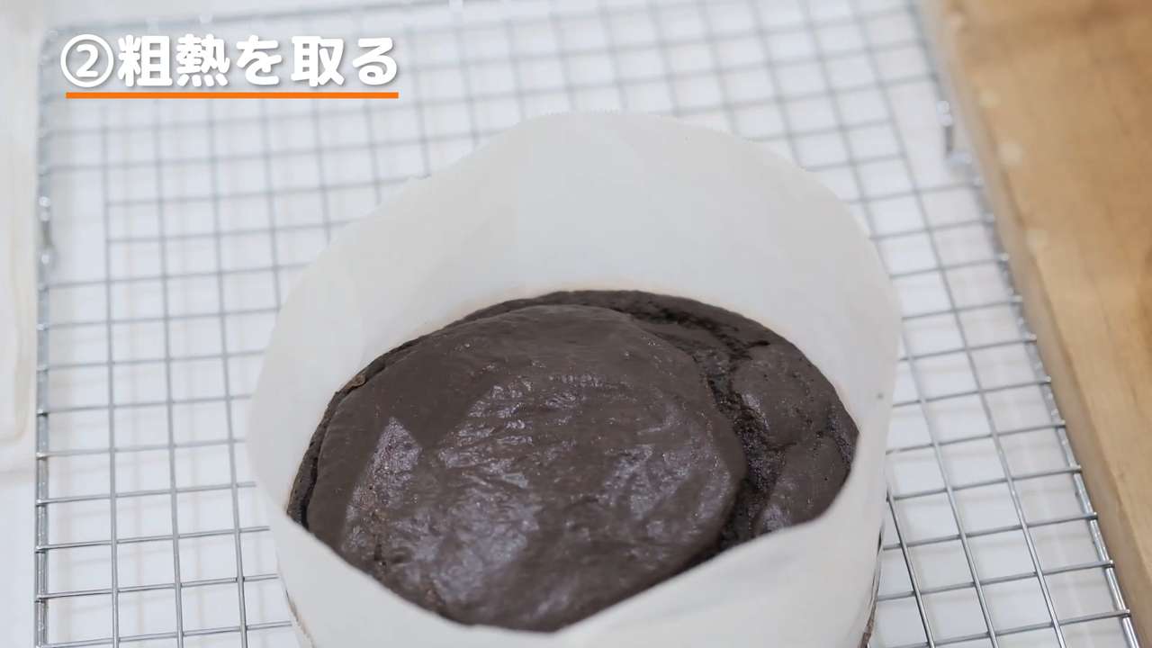 オーブンから取り出して、オーブンシートを付けたまますぐに網の上にのせて粗熱を取る。粗熱が取れたら冷蔵庫で冷やす。- 4