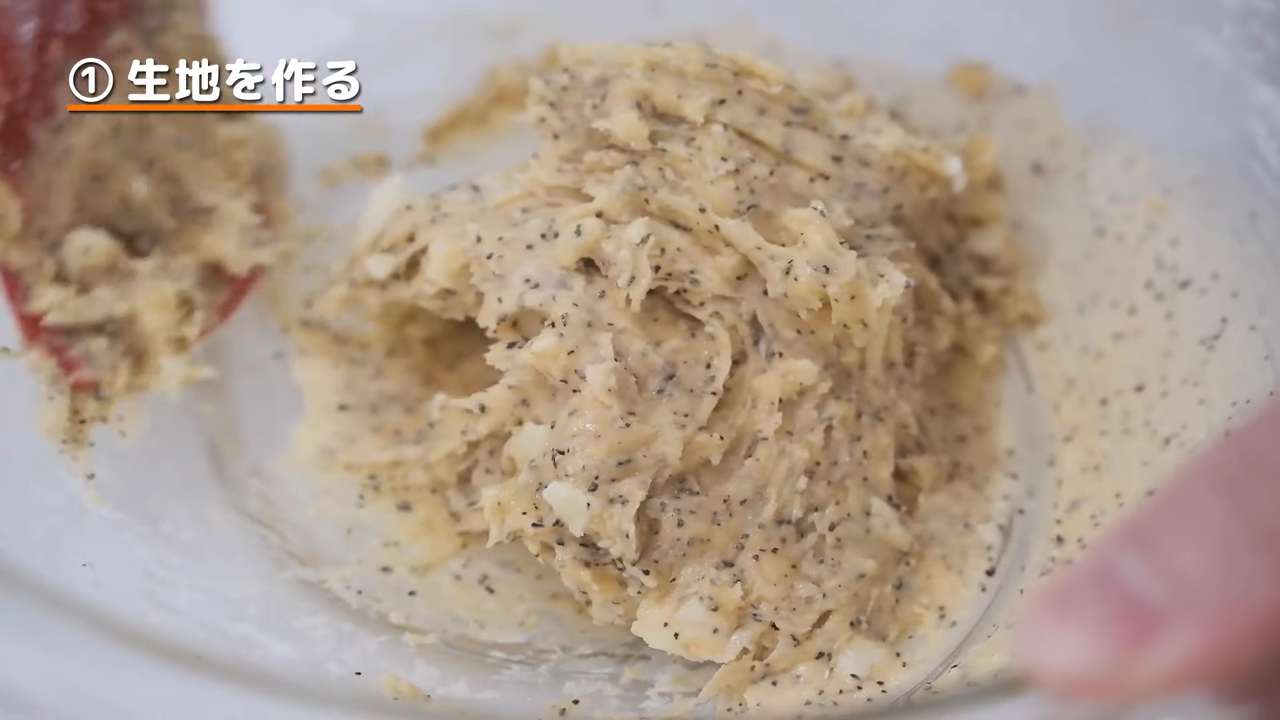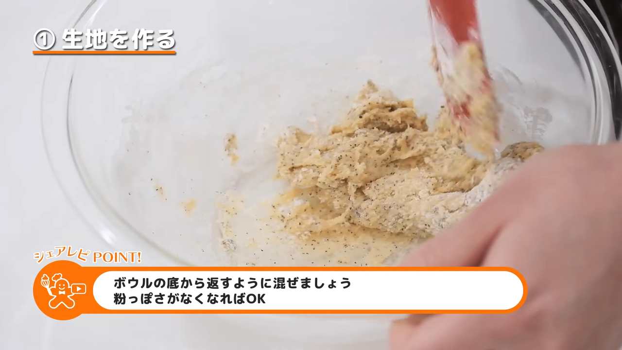 卵に粉類とアールグレイ茶葉を加えて、ゴムベラでボウルの底から返すように混ぜる。粉っぽさがなくなればOK。- 5