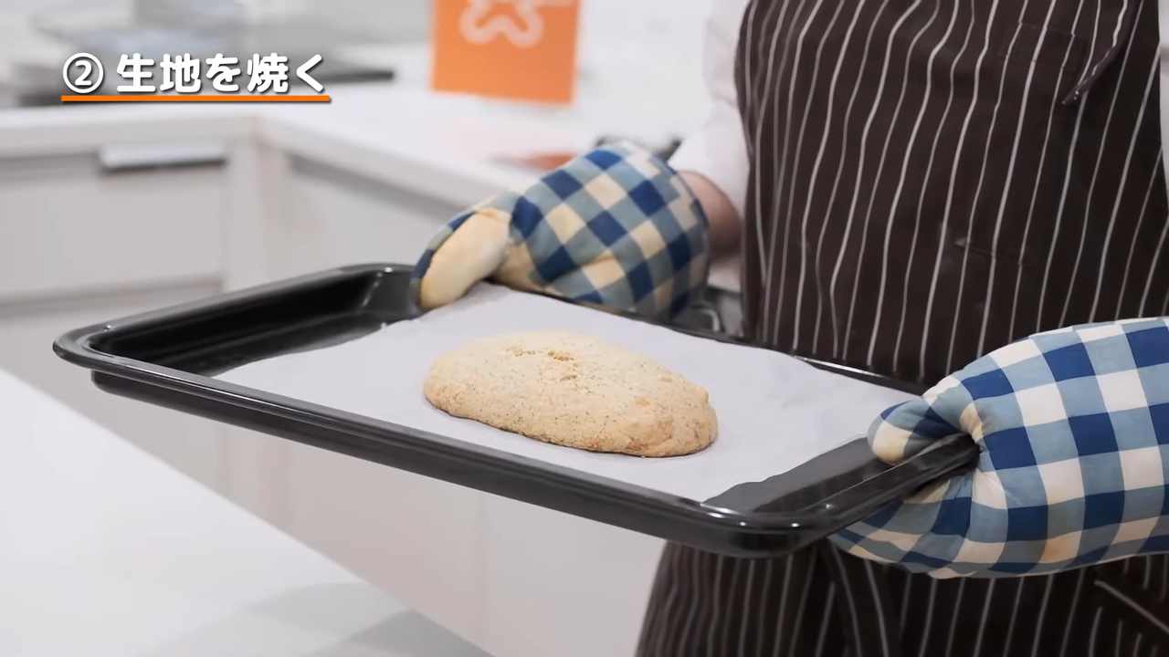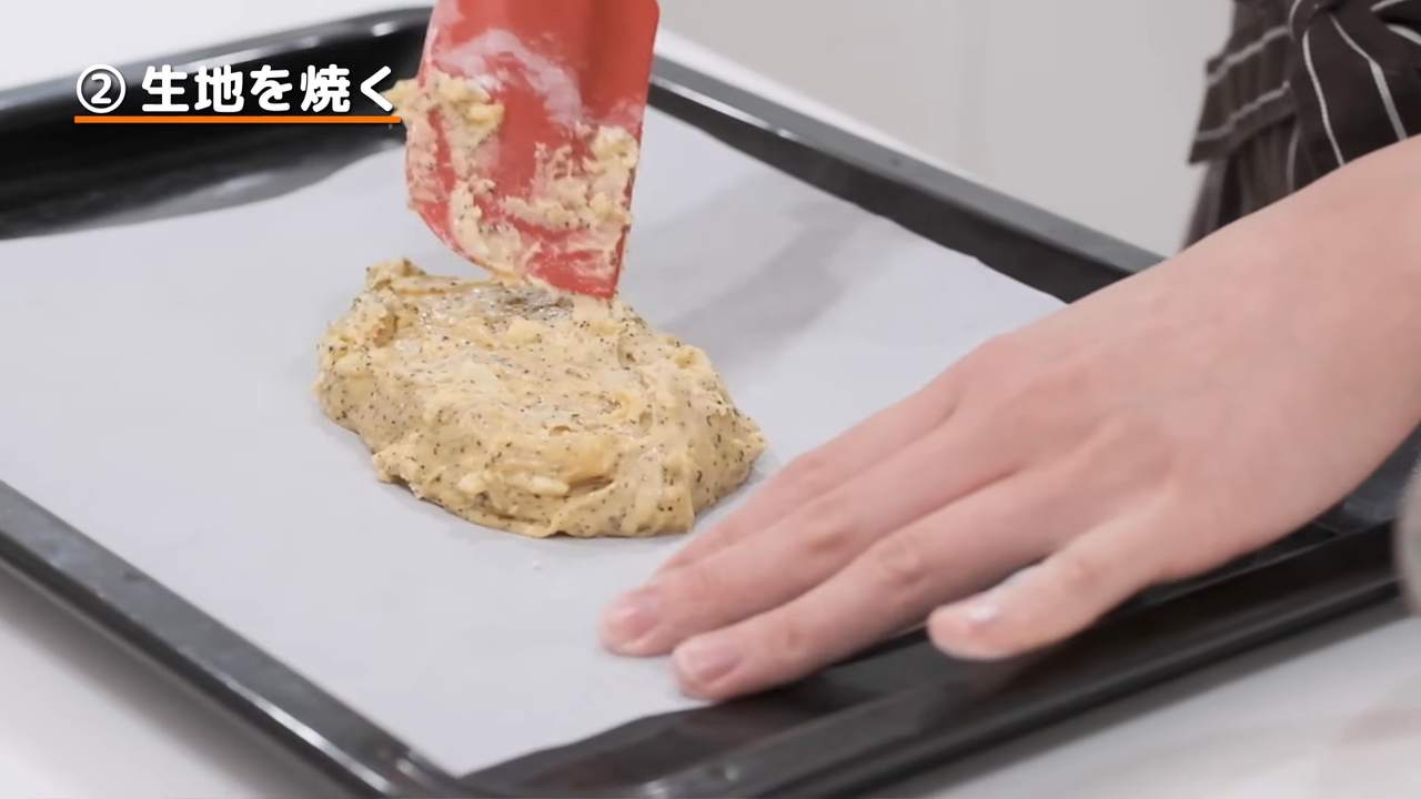 オーブンシートを敷いた天板に、生地を細長い楕円形(長さは好みで)になるように広げる。150℃のオーブンで約25分間焼く。- 7