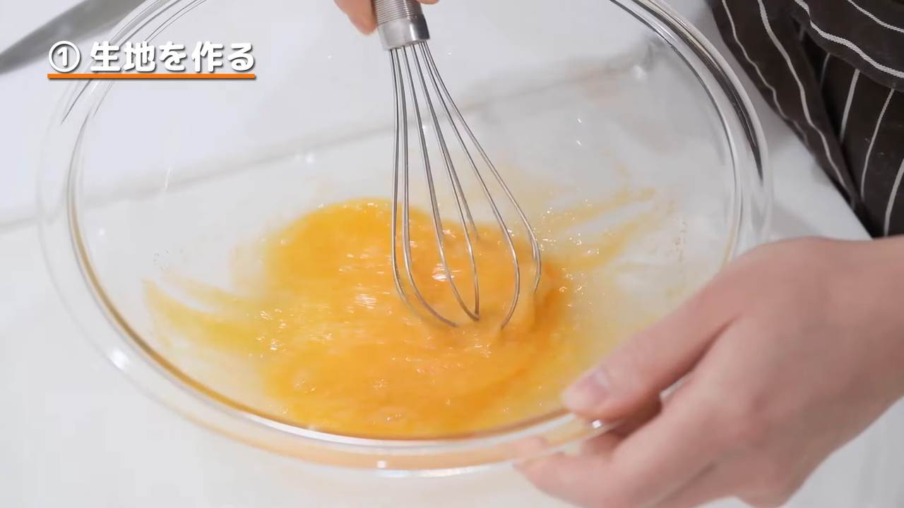 ボウルに卵を入れて溶きほぐし、砂糖を加えて混ぜる。- 2