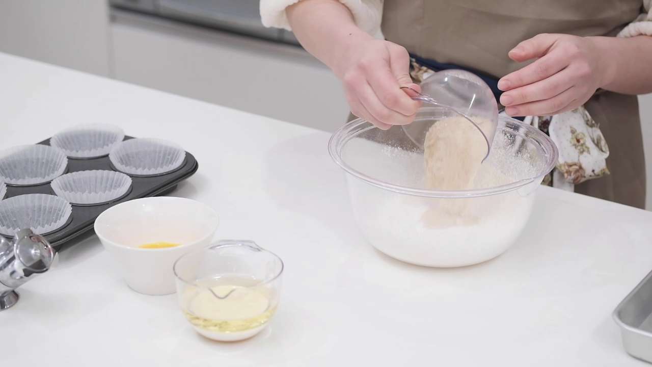 薄力粉、ベーキングパウダーをダマが残らないように合わせてふるう。きび砂糖を加えてホイッパーでしっかり混ぜる。