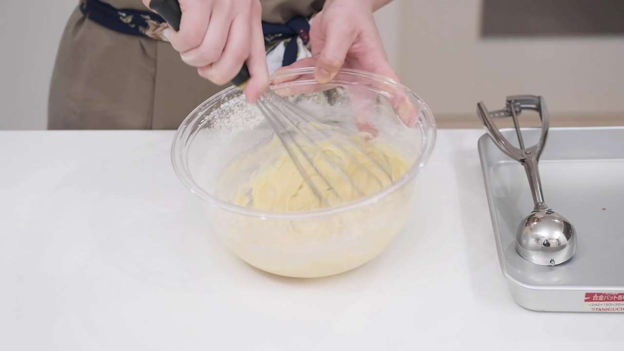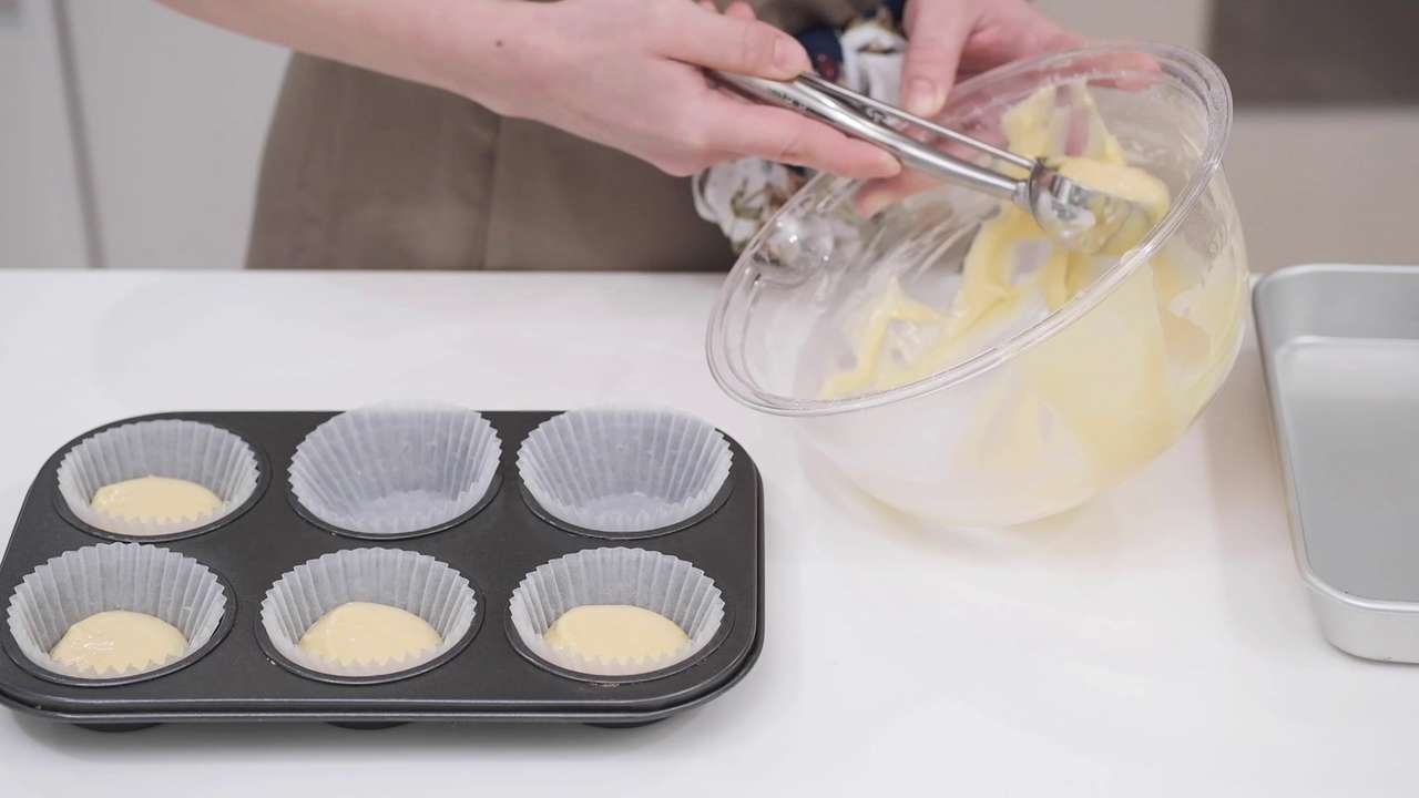 グラシン紙をセットした型にアイスディッシャーで流して、150℃に予熱したオーブンで30~40分間焼く。