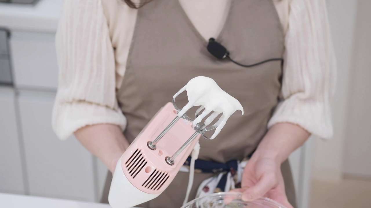 生クリームにきび砂糖を加えてハンドミキサーでツノが立つまで泡立てる。