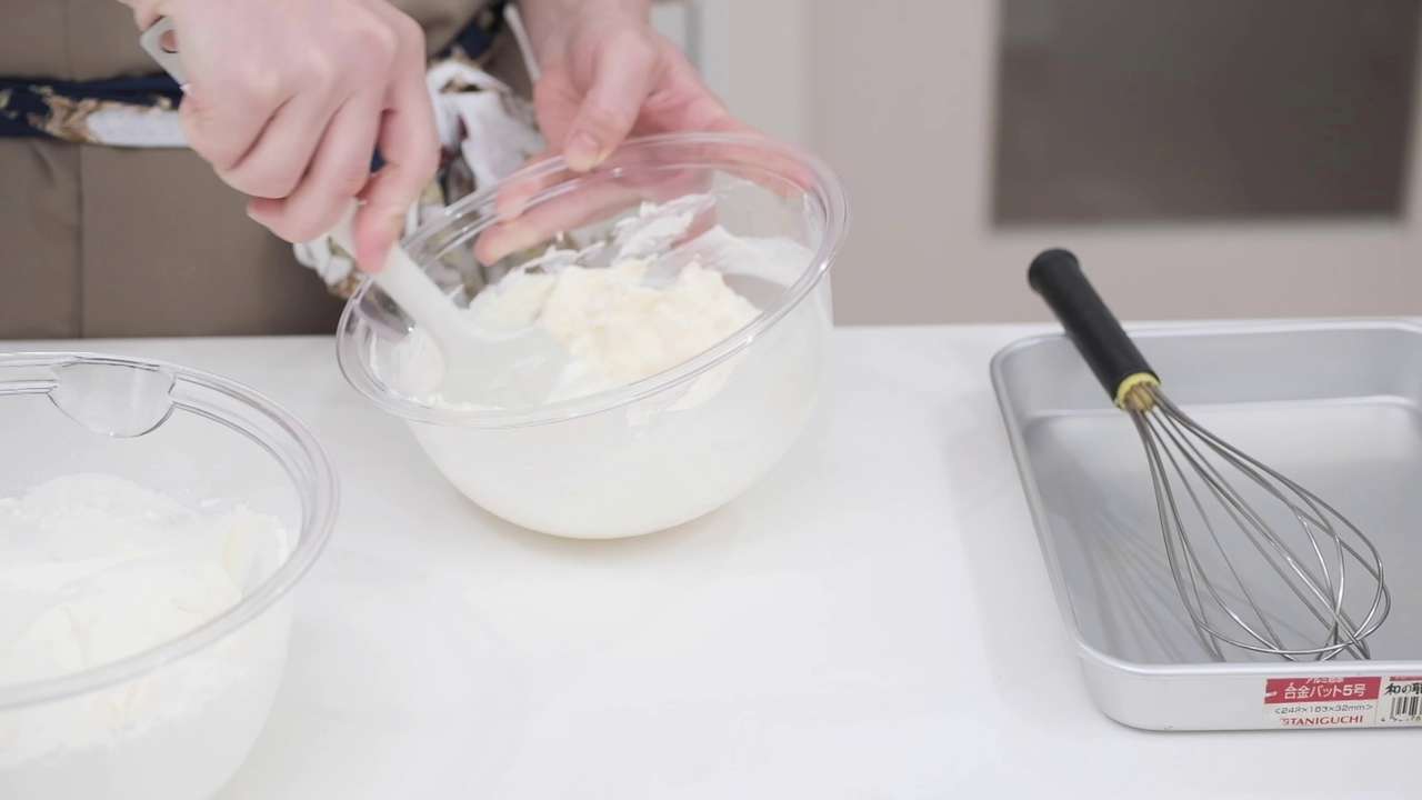 マスカルポーネをゴムベラで柔らかくする。生クリームと数回に分けて合わせる。マスカルポーネを加えることで絞った時に形が崩れにくくなる。