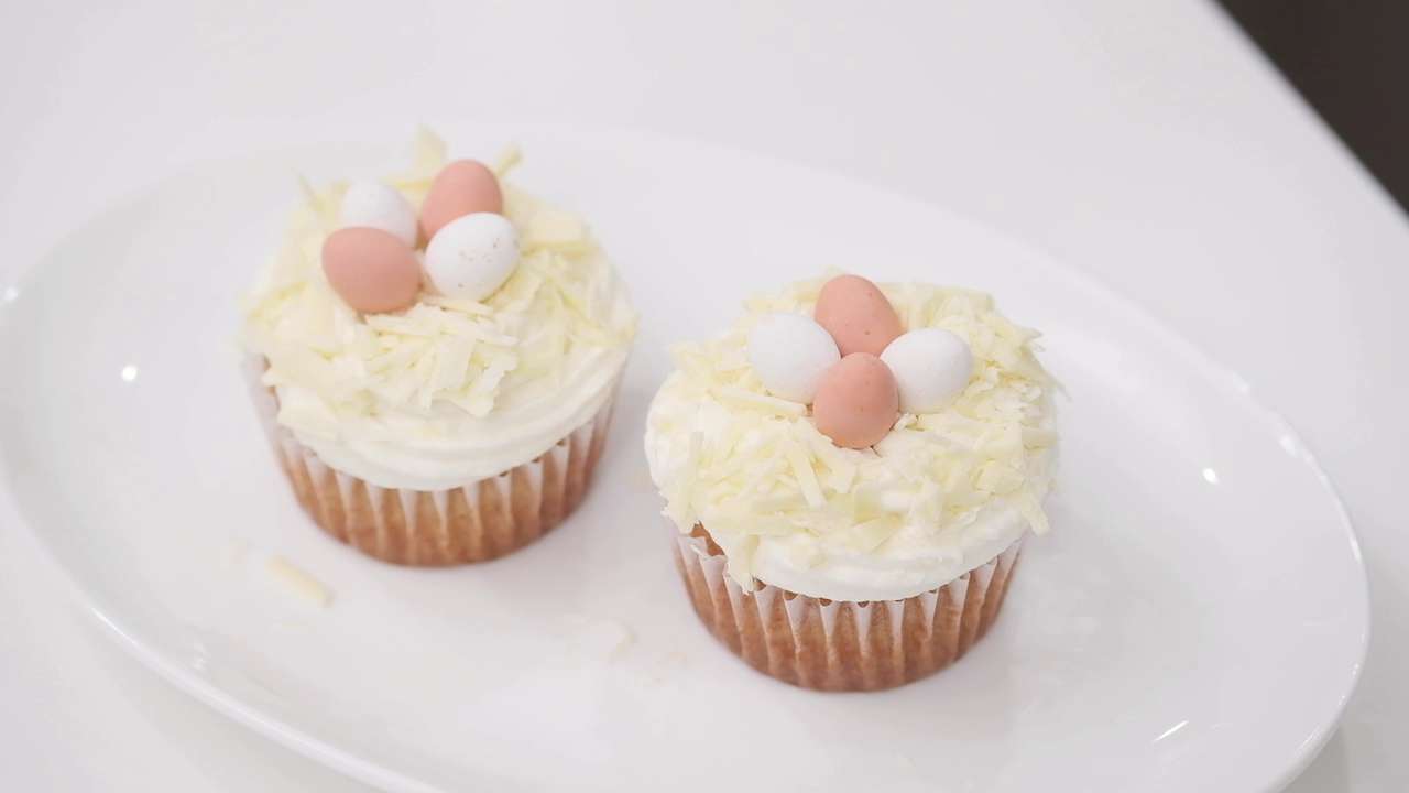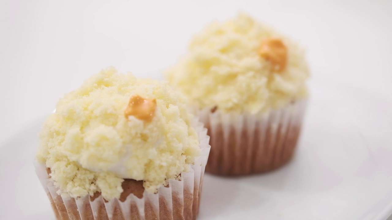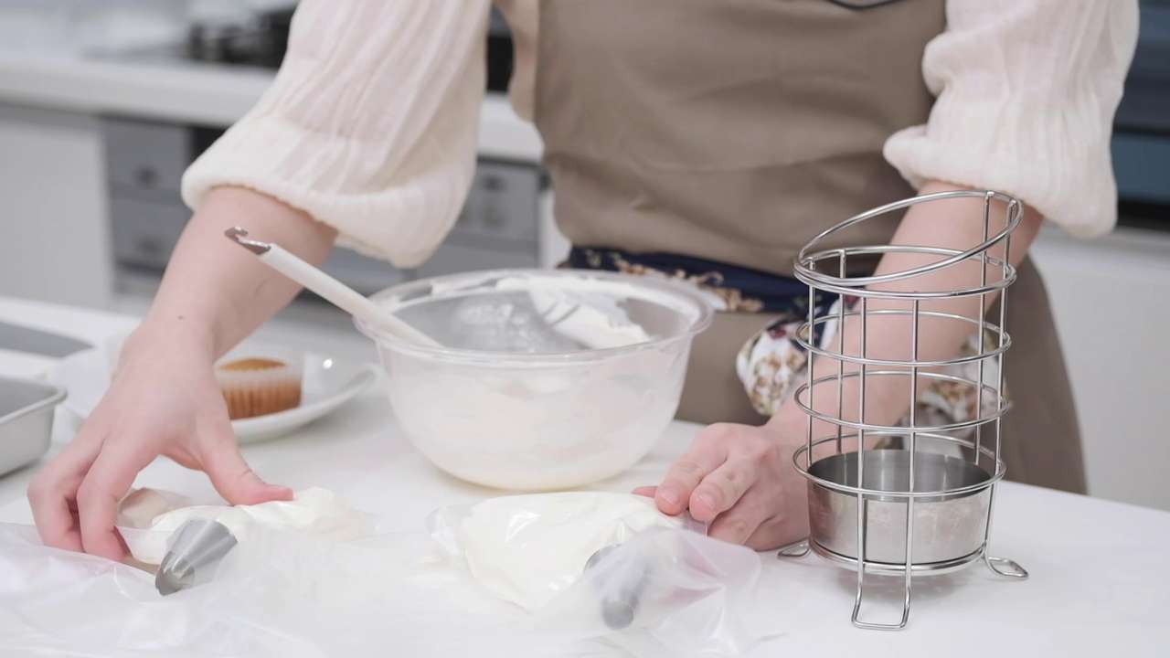 星口金の絞り袋にクリームを入れ、カップケーキの表面に外側から中心に向かってグルグルと絞る。