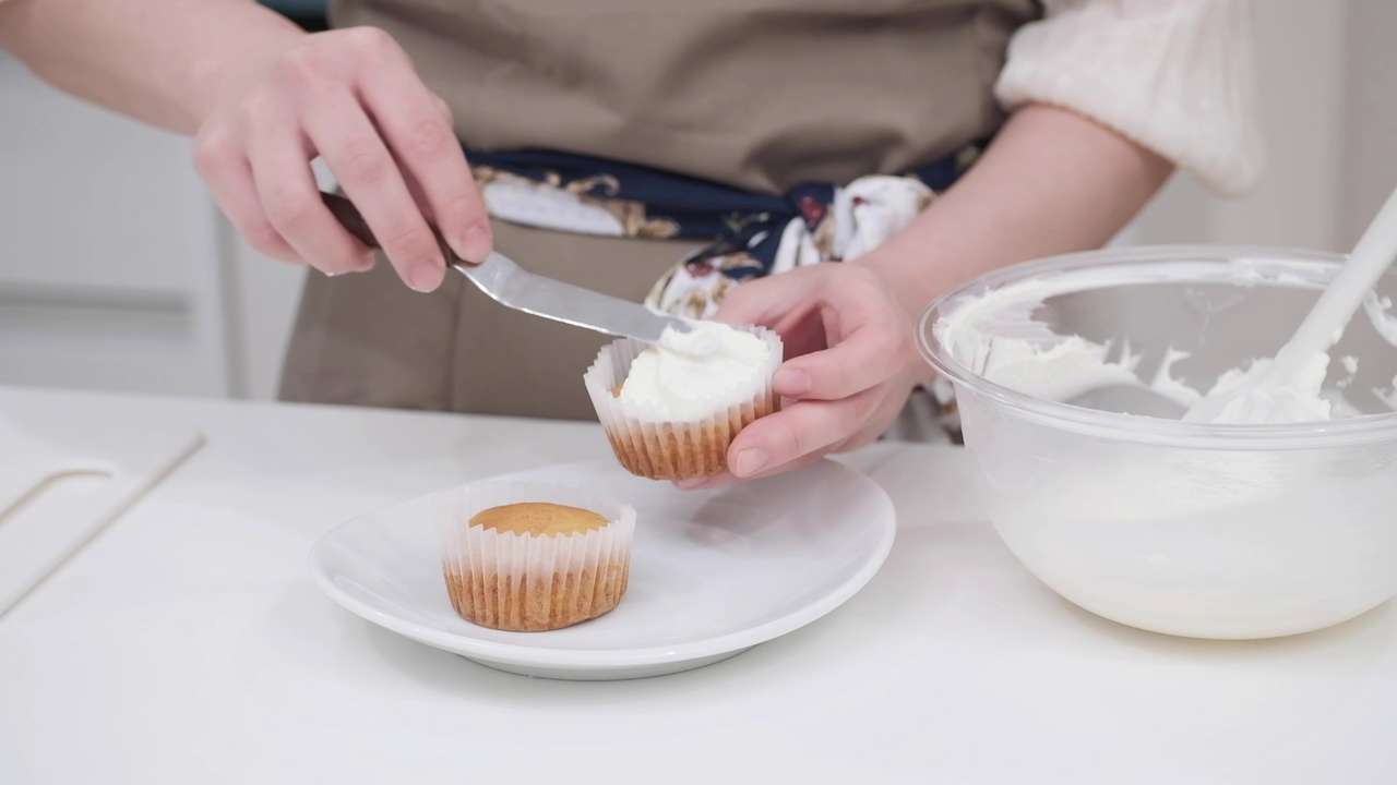 カップケーキの表面にパレットナイフでクリームを塗る。上に生地が隠れる程度に塗る。