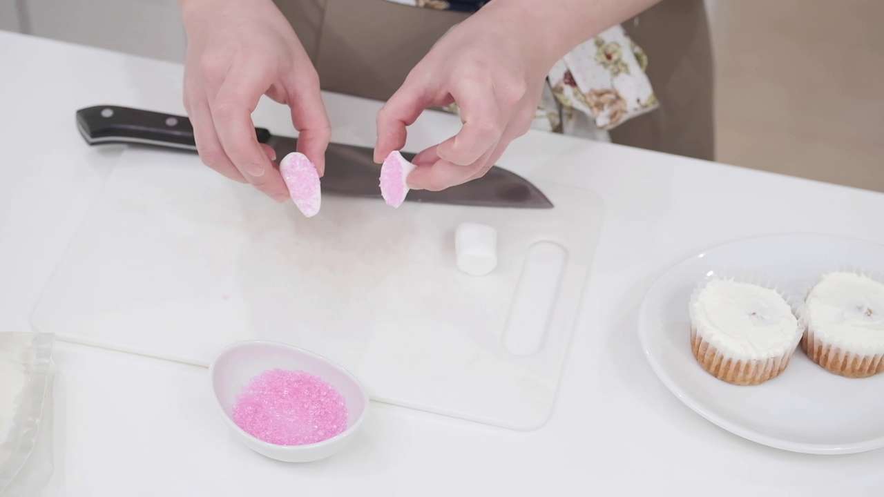 マシュマロを斜めにカットし、カット面にクリスタルシュガーをつける(耳)。