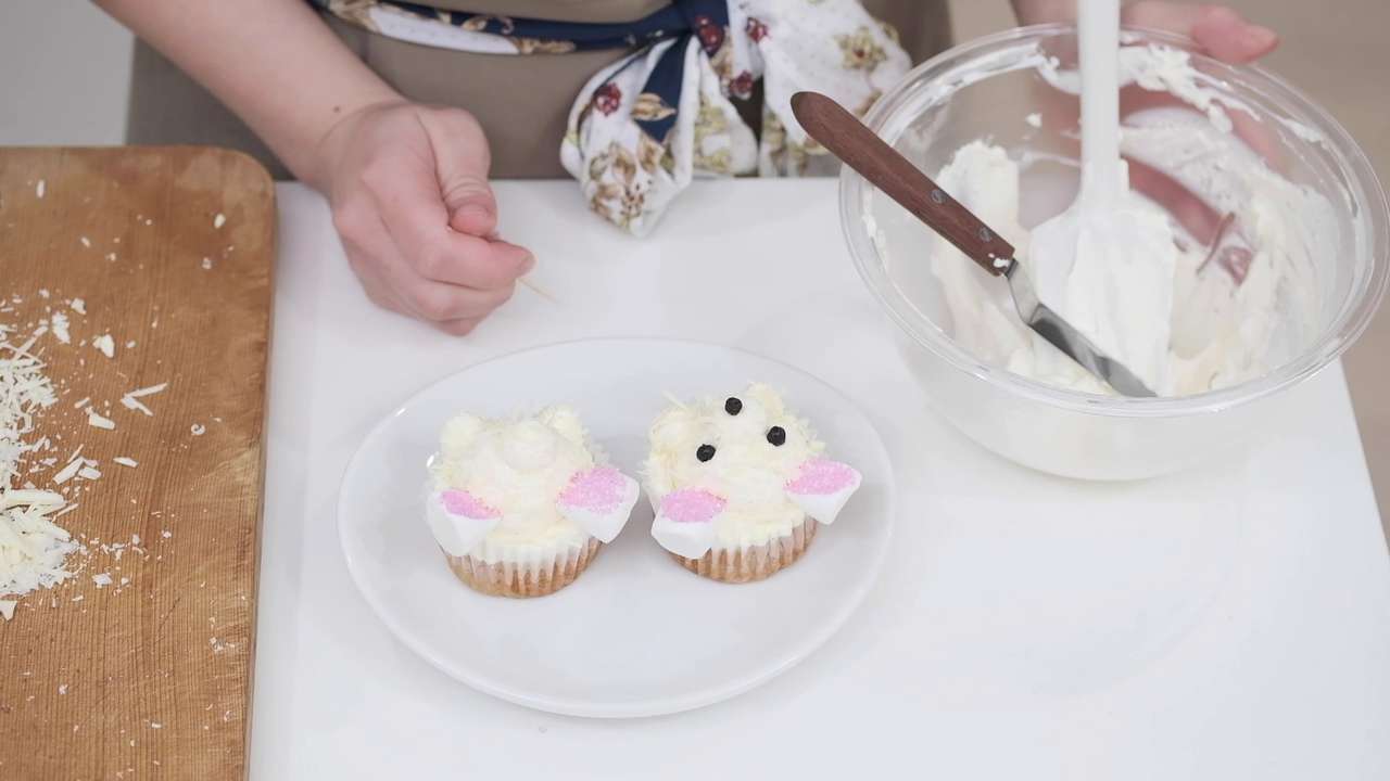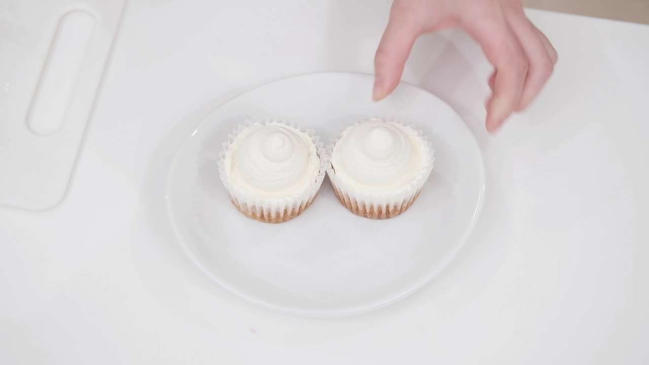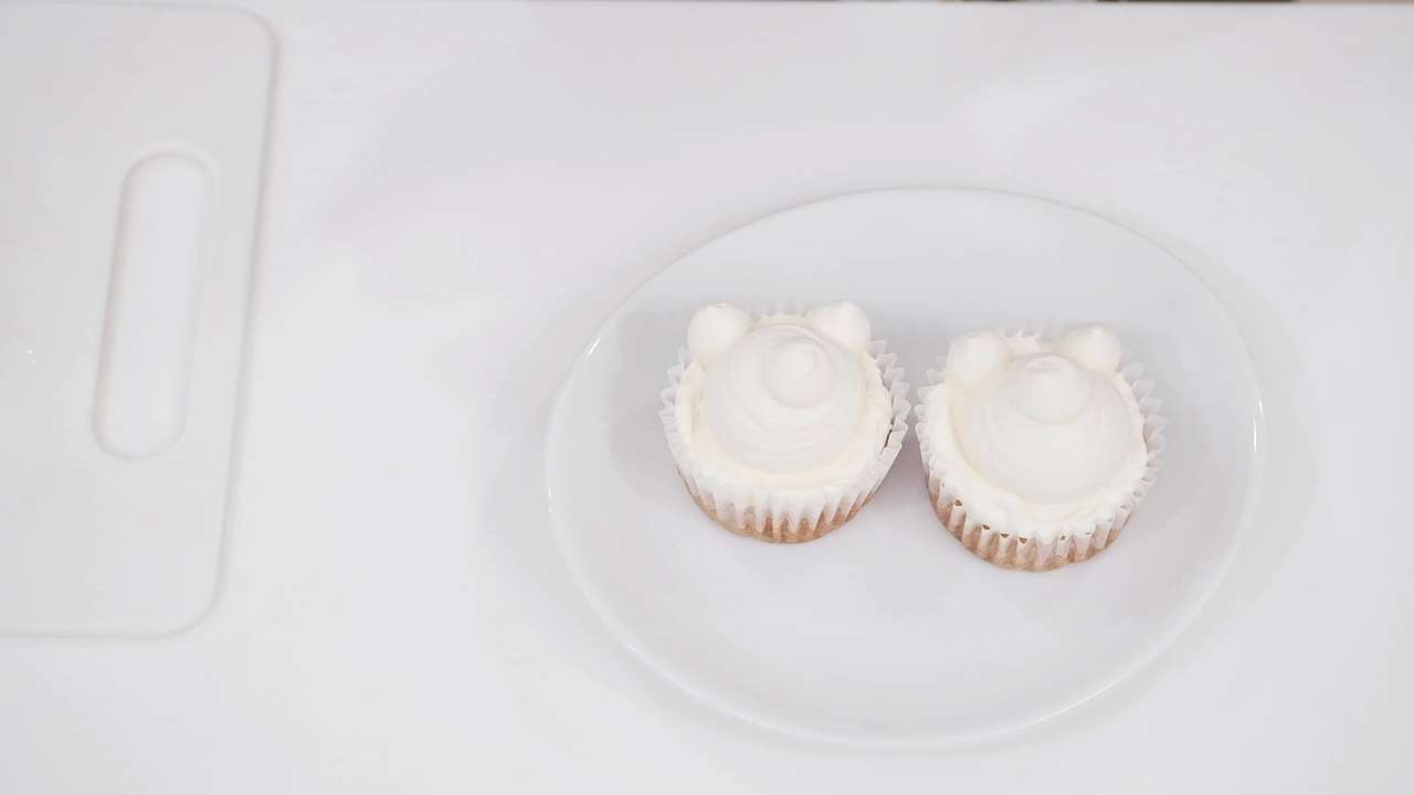 カップケーキの上に丸い口金の方の絞り袋のクリームを真上から絞っていく。まずは丸く全体に絞り、その上もう一つにちょんと絞る(鼻)。上から見ると2段のクリームが重なっている状態になる。