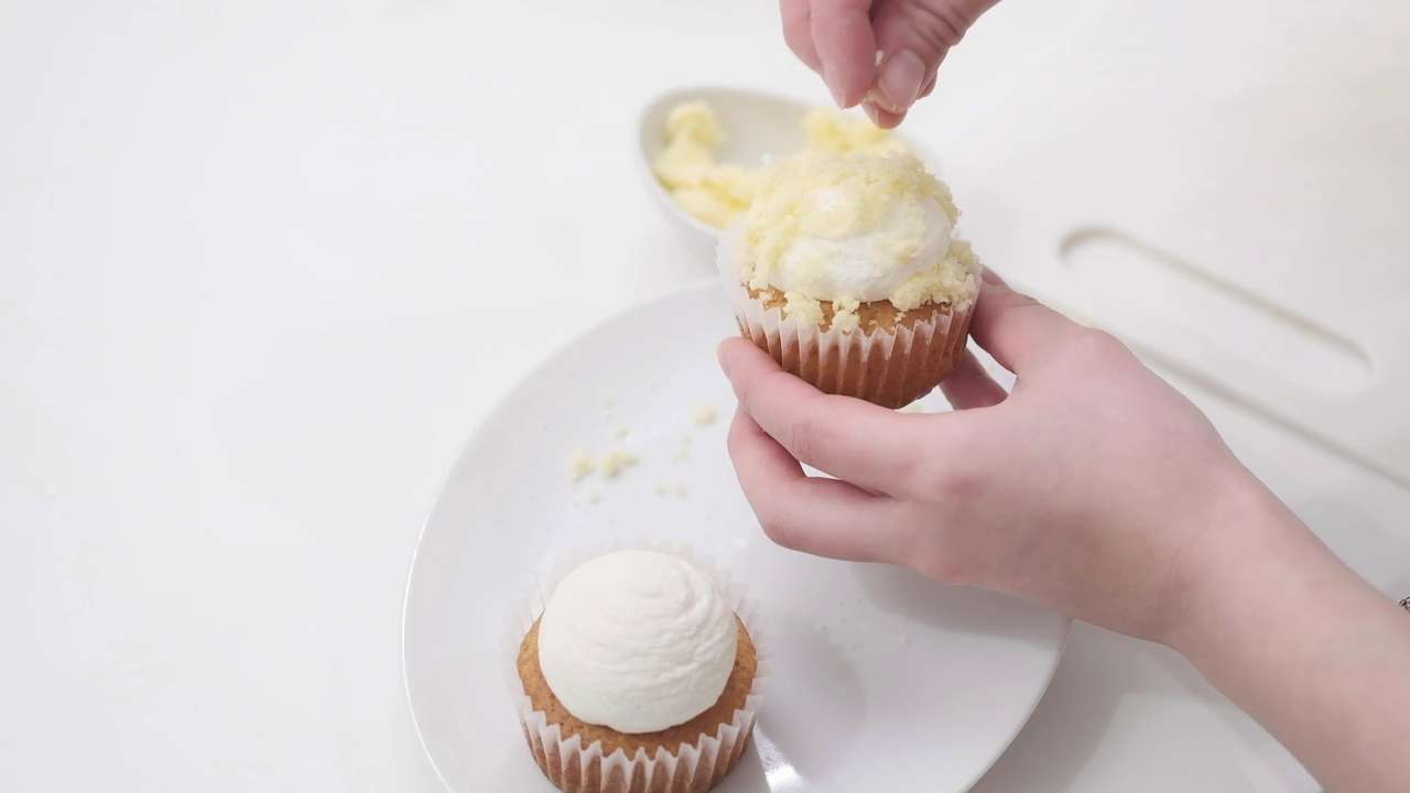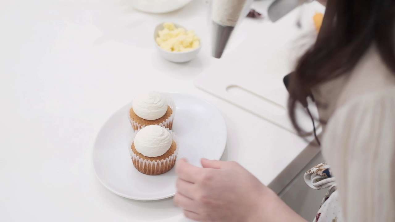 カップケーキの上に丸い口金の方の絞り袋のクリームを真上から絞っていく。少し大きめにカップケーキの中心にこんもりとなるように絞る。