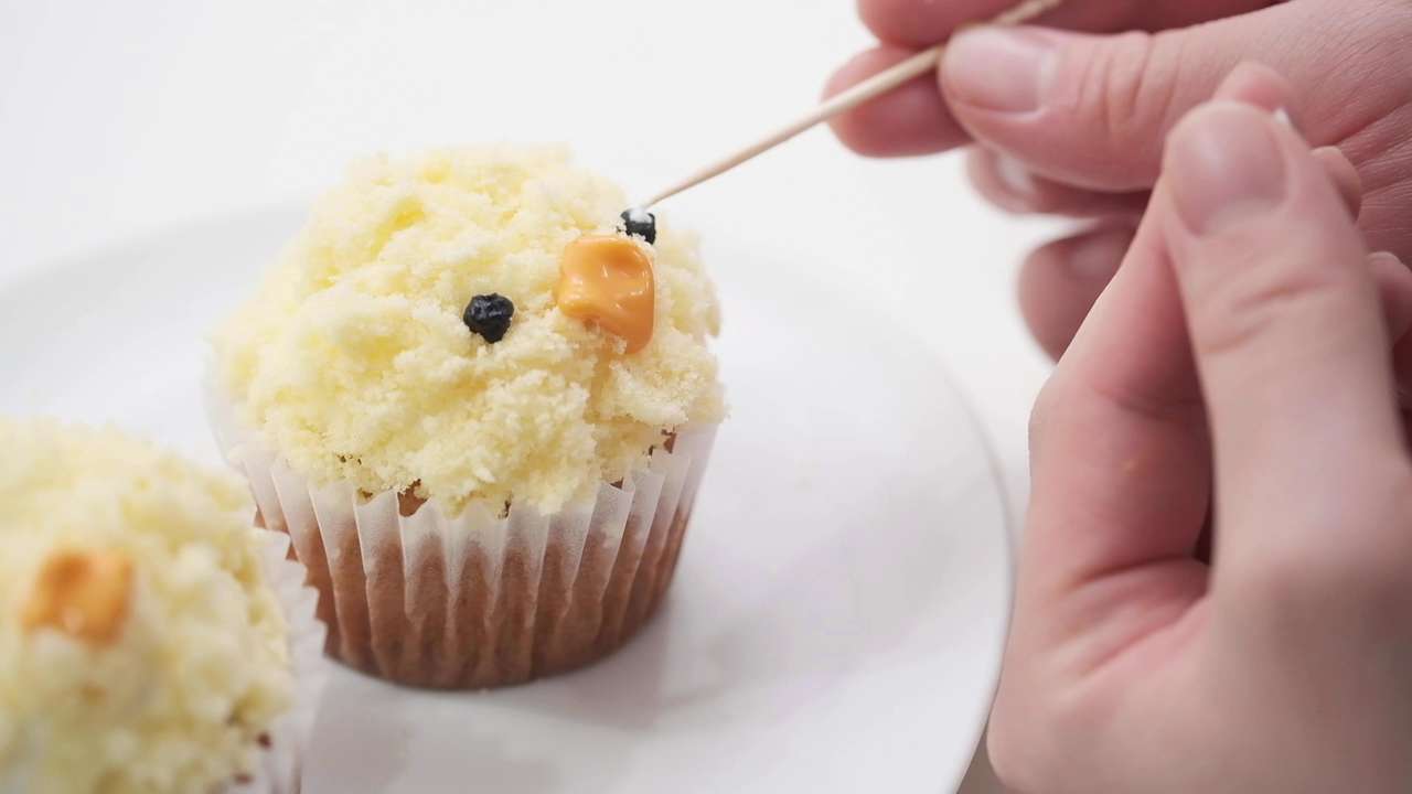 目の位置にドライブルーベリー(小さくて形がそろっているものが好ましい)を入れる。くちばしの両サイドに押し込む。クリームを爪楊枝に少し取ってブルーベリーに乗せる(瞳)。黒のチョコペン(湯船やレンジで溶かす)でもう一つのヒヨコの目を描く。先ほどのブルーベリーと同じような位置に真上から描く。また先程と同様にクリームを爪楊枝に少し取ってブルーベリーに乗せる(瞳)。