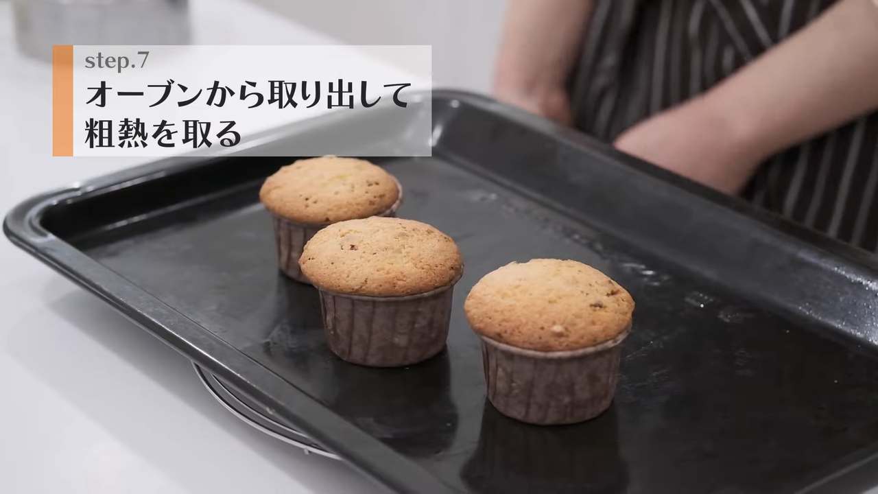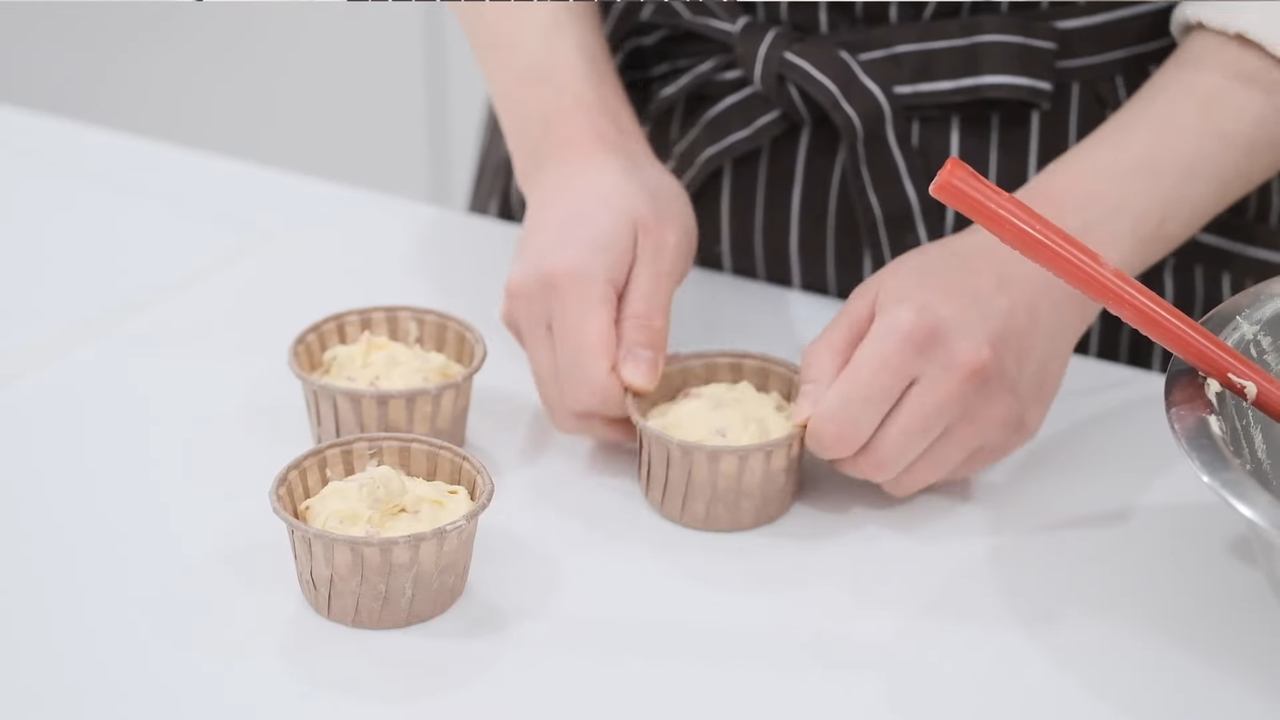 カップに流し入れ、台に数回叩きつけて空気を抜く。150℃のオーブンで約35分間焼く。- 8