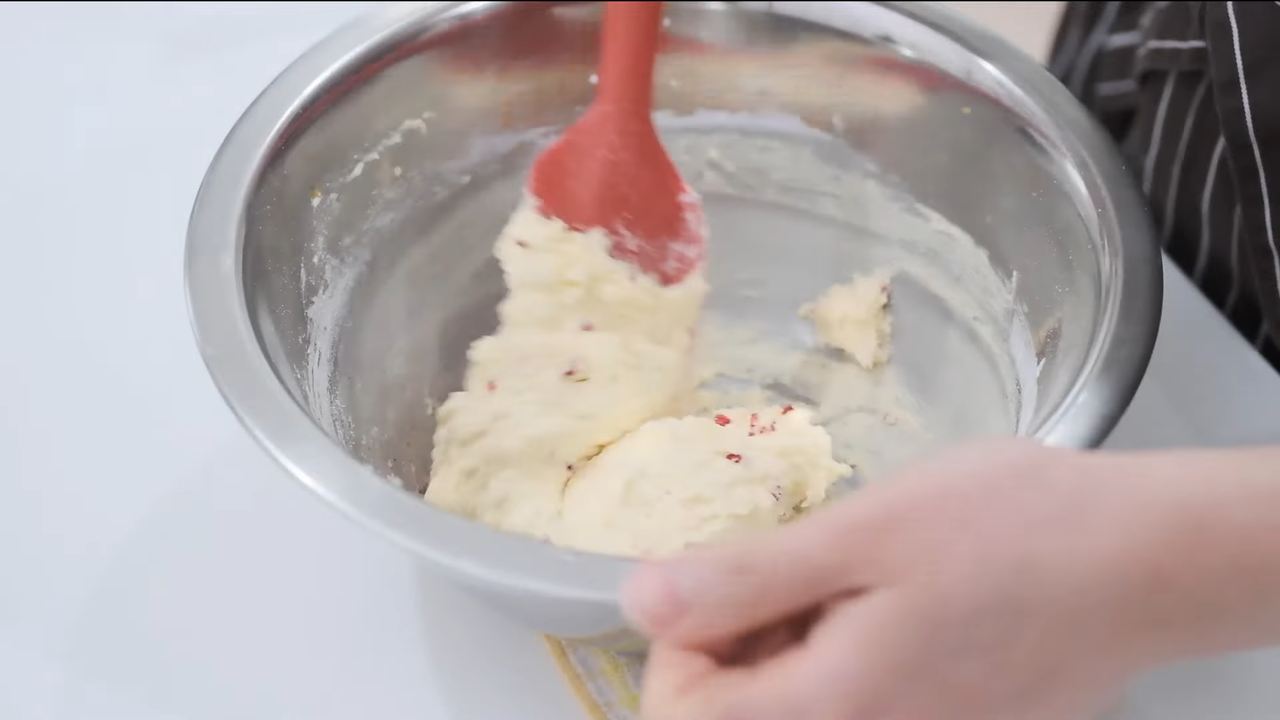 フランボワーズフレークとホワイトチョコレートチップを加えて混ぜる。- 7