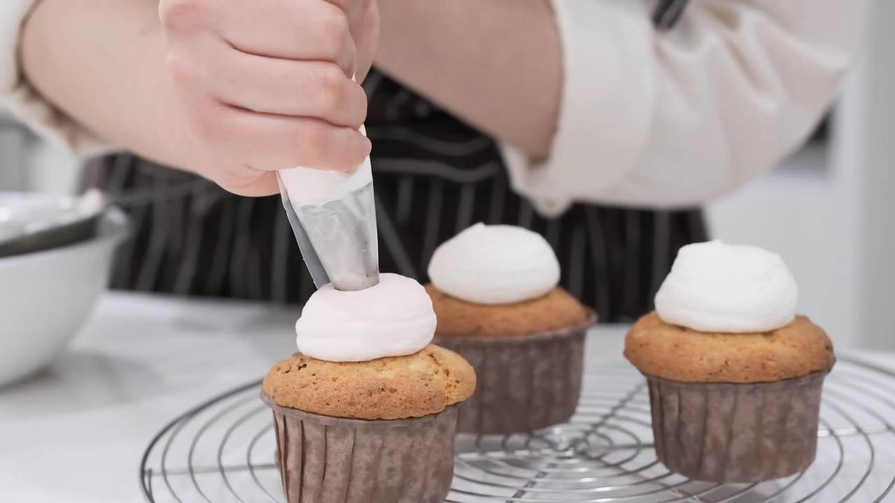 生クリームにグラニュー糖を加えて8分立てにする。丸口金を付けた絞り袋に入れてカップケーキの上に絞る(各30g)。- 3
