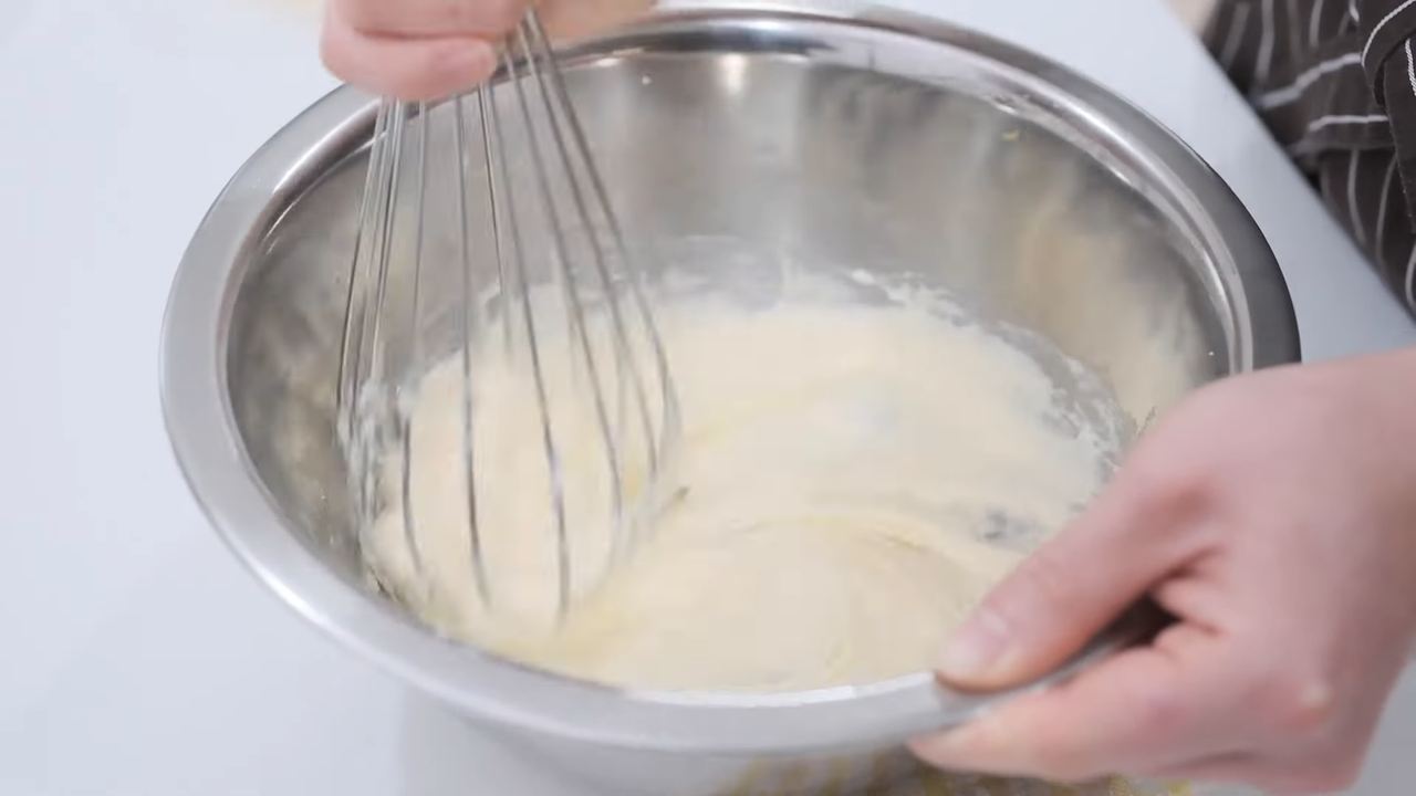 アーモンドプードルを加えて混ぜ、残りの卵を加えて混ぜる。- 5
