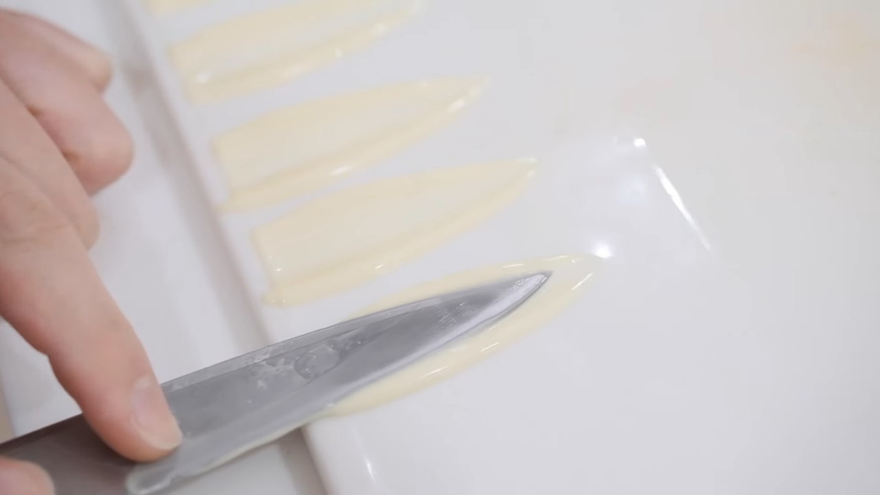 チョコレートのテンパリングを取る。湯煎で溶かしたホワイトチョコレートチップ(分量外)に刻んだチョコレートチップ(分量外)を加えて29℃まで下げる。OPPシートの上に、ナイフに付けたチョコレートを押し付けて耳の飾りを作る。- 2