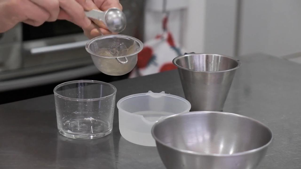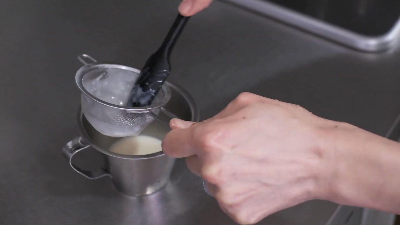 ゼラチンが溶けたら、全体を混ぜ合わせてザルで漉す。- 7