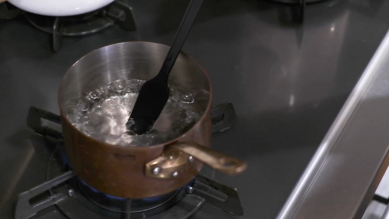 小鍋にグラニュー糖と水を入れて沸騰させる。- 3