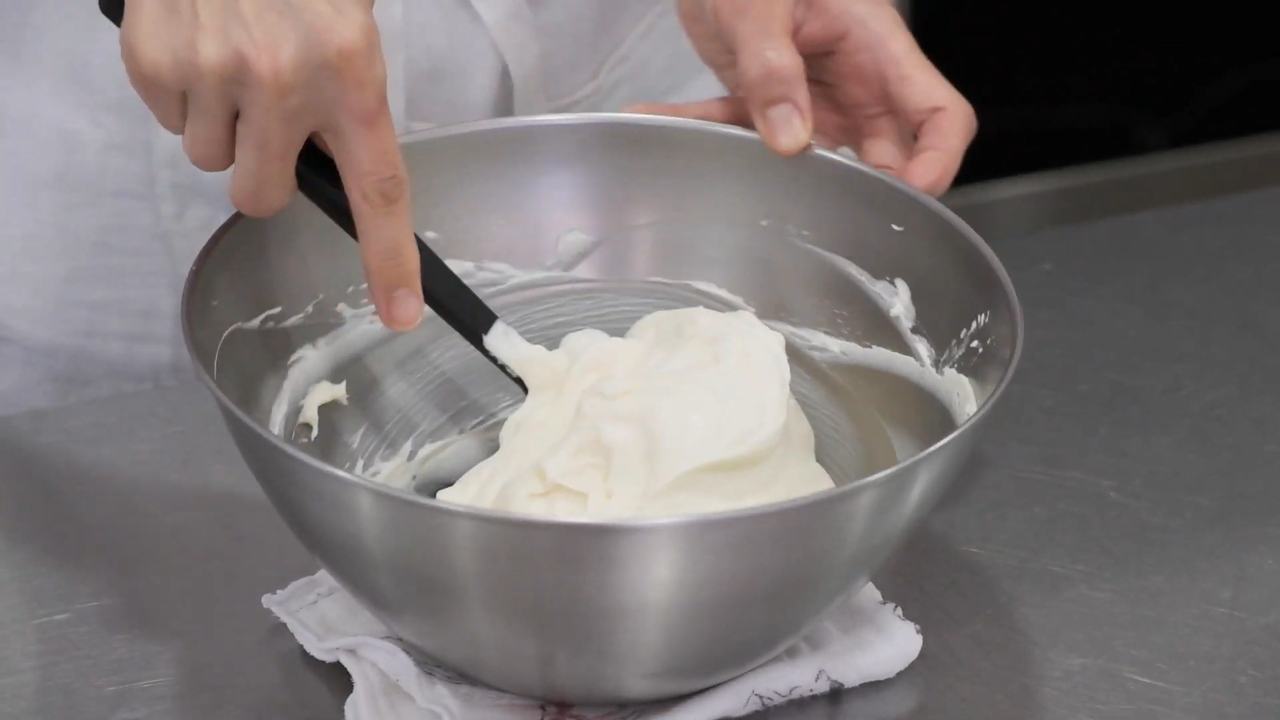 生クリームを少量加えて軽く混ぜたら、残りの生クリームを加えて混ぜる。- 9