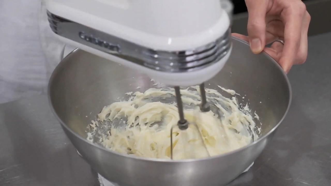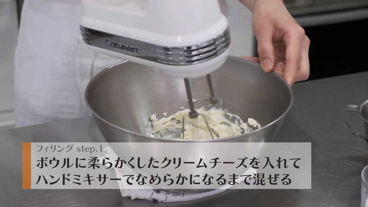 ボウルに柔らかくしたクリームチーズを入れて、ハンドミキサーでなめらかになるまで混ぜる。- 2