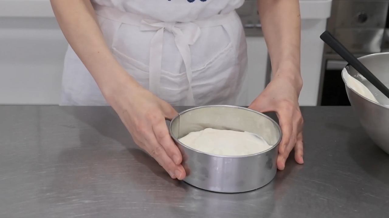 冷蔵庫から出して型をはずす。※型よりもひと回り小さな容器に型をのせて、側面を熱い布巾で温めると型抜きしやすい。
