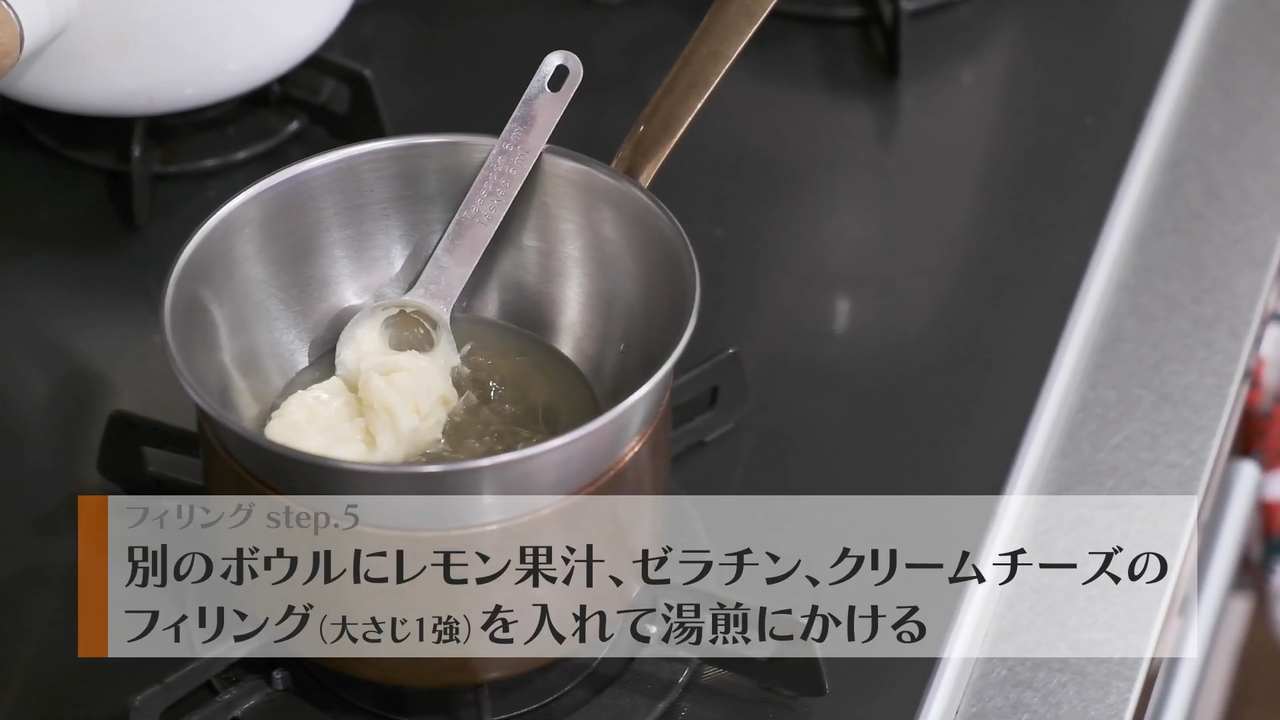 別のボウルにレモン果汁、ゼラチン、クリームチーズのフィリング(大さじ1強)を入れて湯煎にかける。- 6
