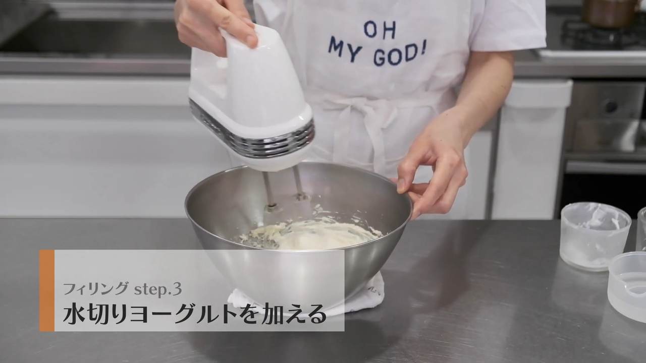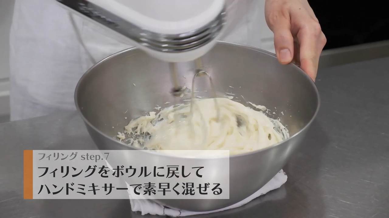 フィリングをボウルに戻して、ハンドミキサーで素早く混ぜる。- 8