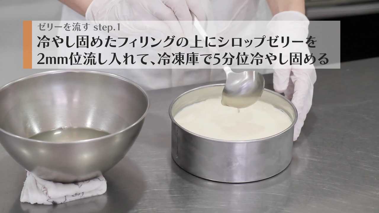 冷やし固めたフィリングの上にシロップゼリーを2mm位流し入れて、冷凍庫で5分位冷やし固める。- 2