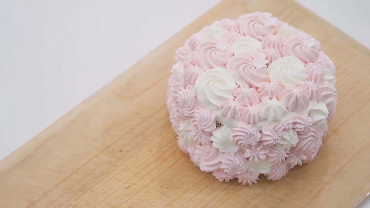 ピンクに着色した生クリームを、バランスを見ながら全体に絞る。- 9