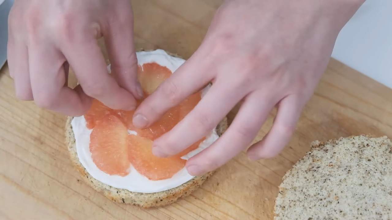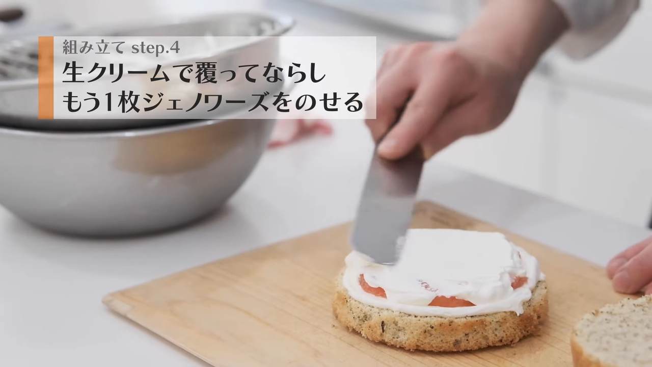 ジェノワーズの上面に生クリームを塗って柑橘をのせる。- 4