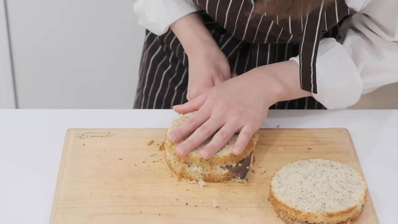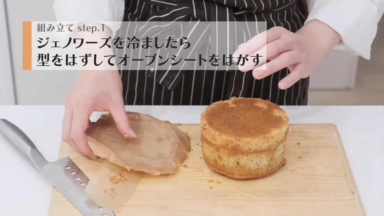 ジェノワーズを冷ましたら、型をはずしてオーブンシートをはがす。- 2