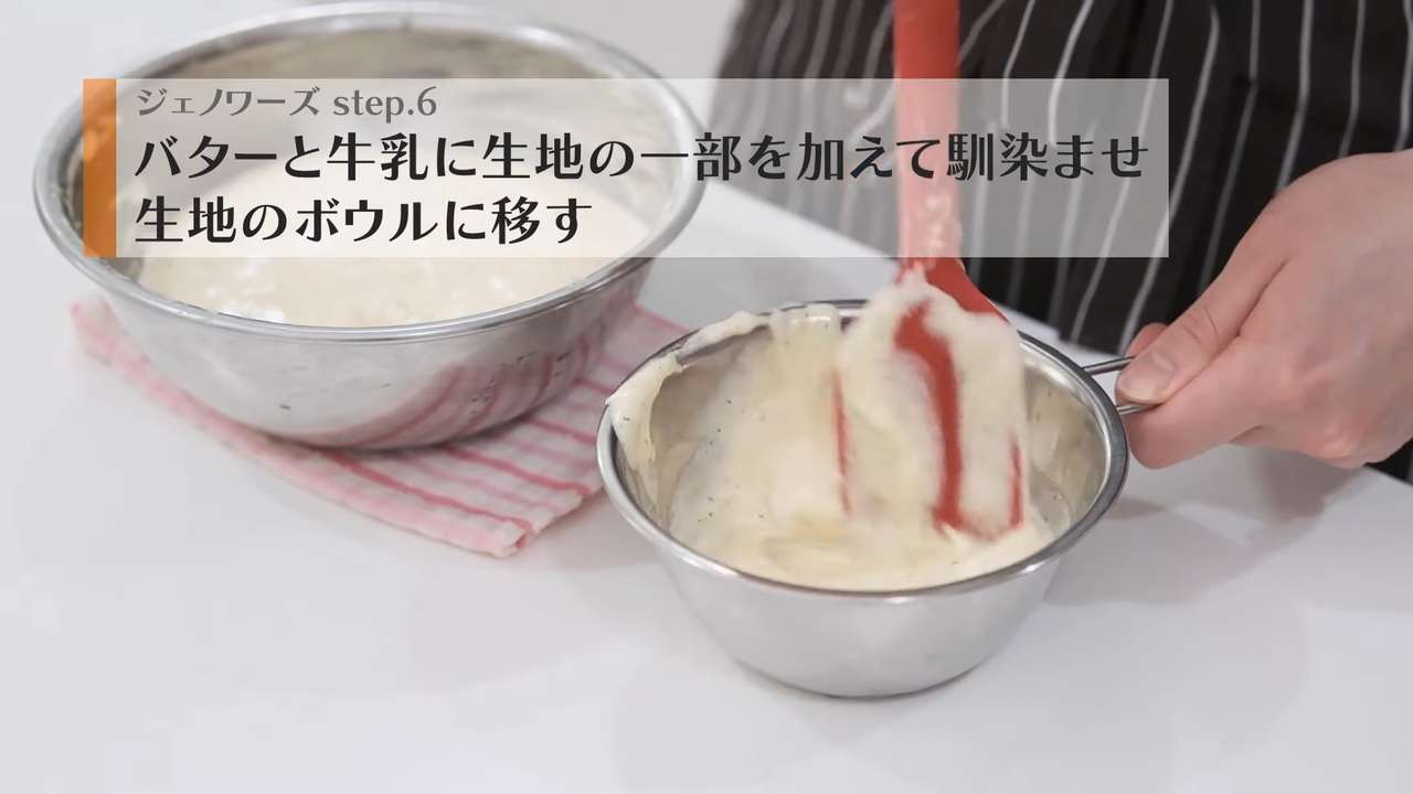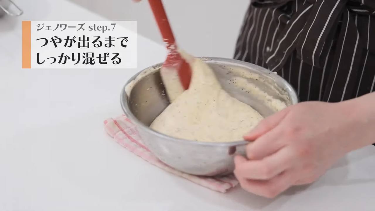 側面と上面に生クリームをナッペする。※側面は生クリームを絞るのでジェノワーズが見えていても構わない。- 7