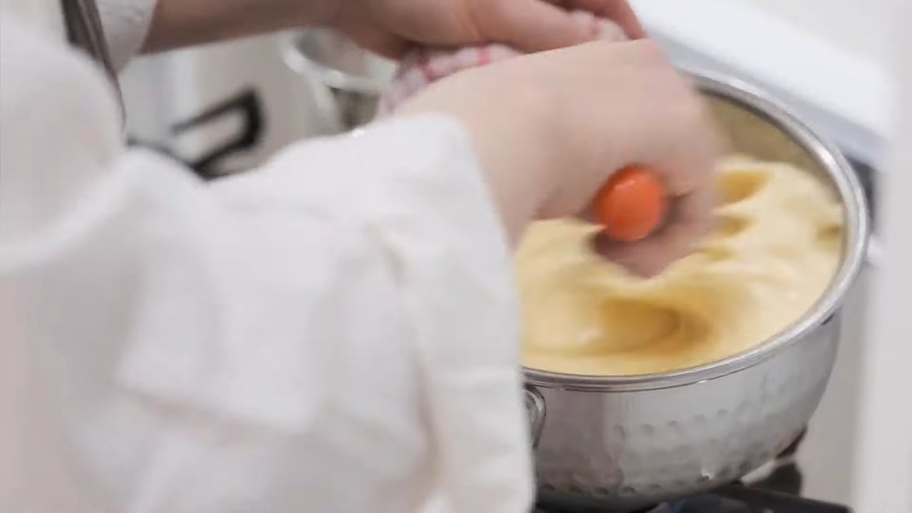 湯煎にかけて40℃台を保ったまましっかり泡立てる。- 3