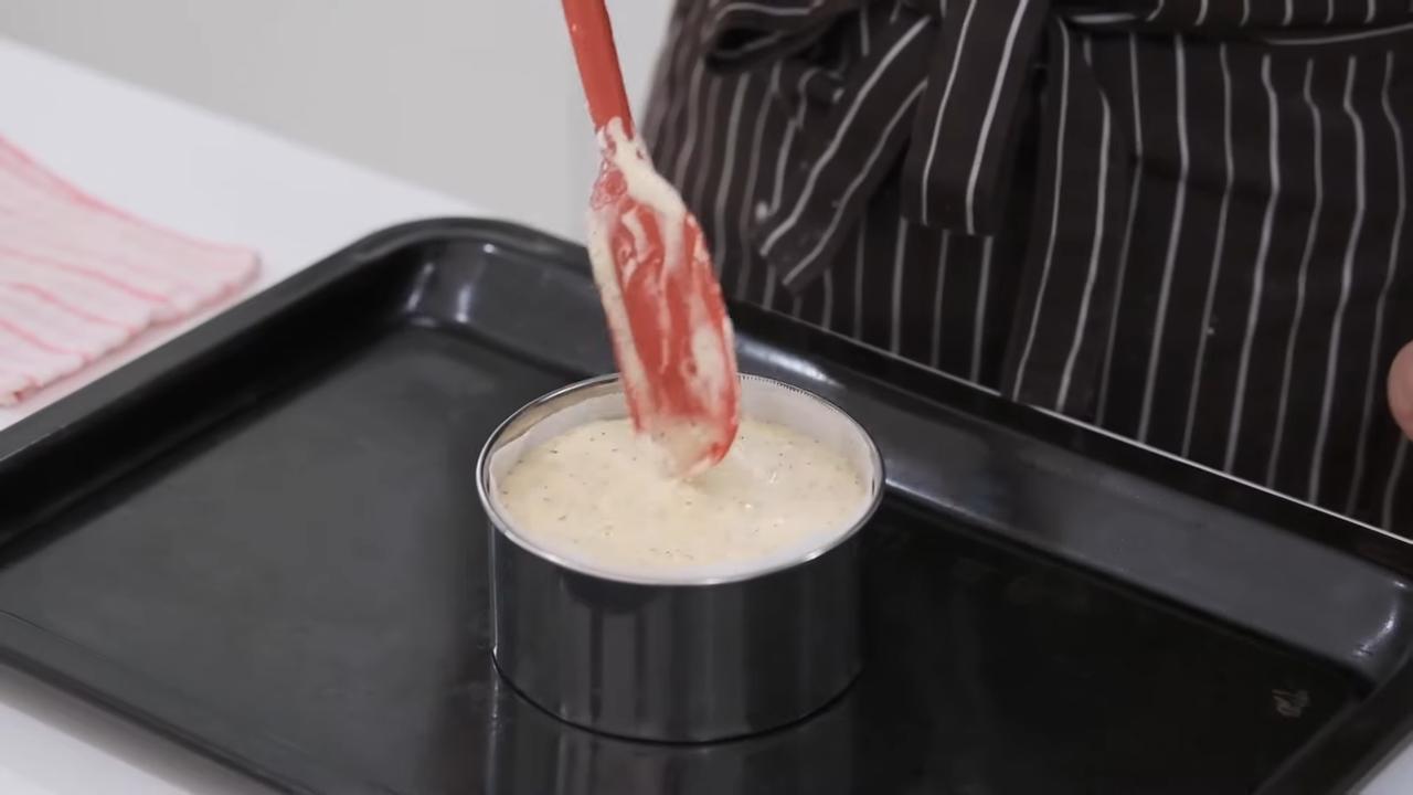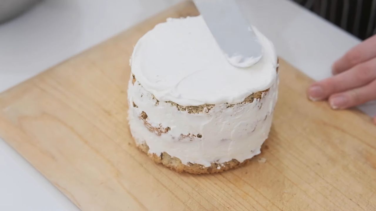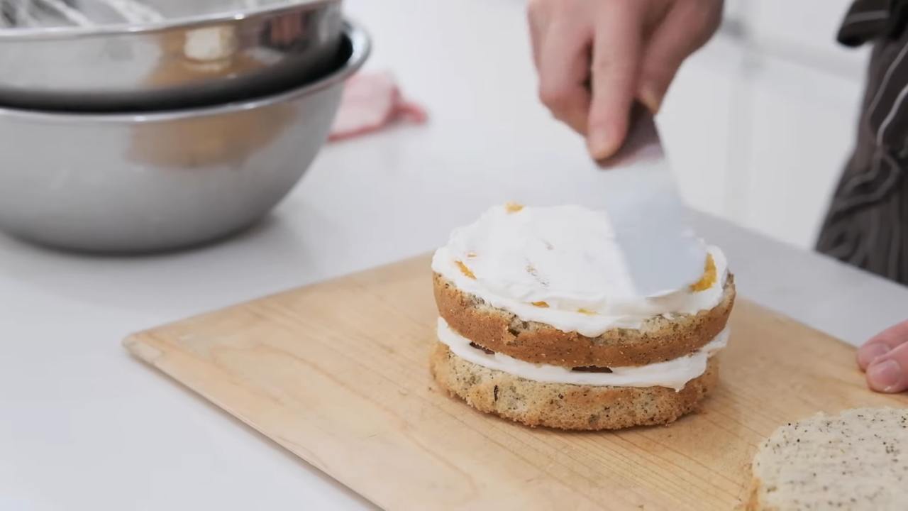 生クリームで覆ってならし、もう1枚ジェノワーズをのせる。- 5
