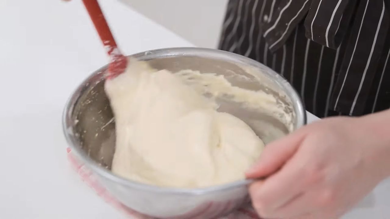 バターと牛乳に生地の一部を加えて馴染ませ、生地のボウルに移す。- 7