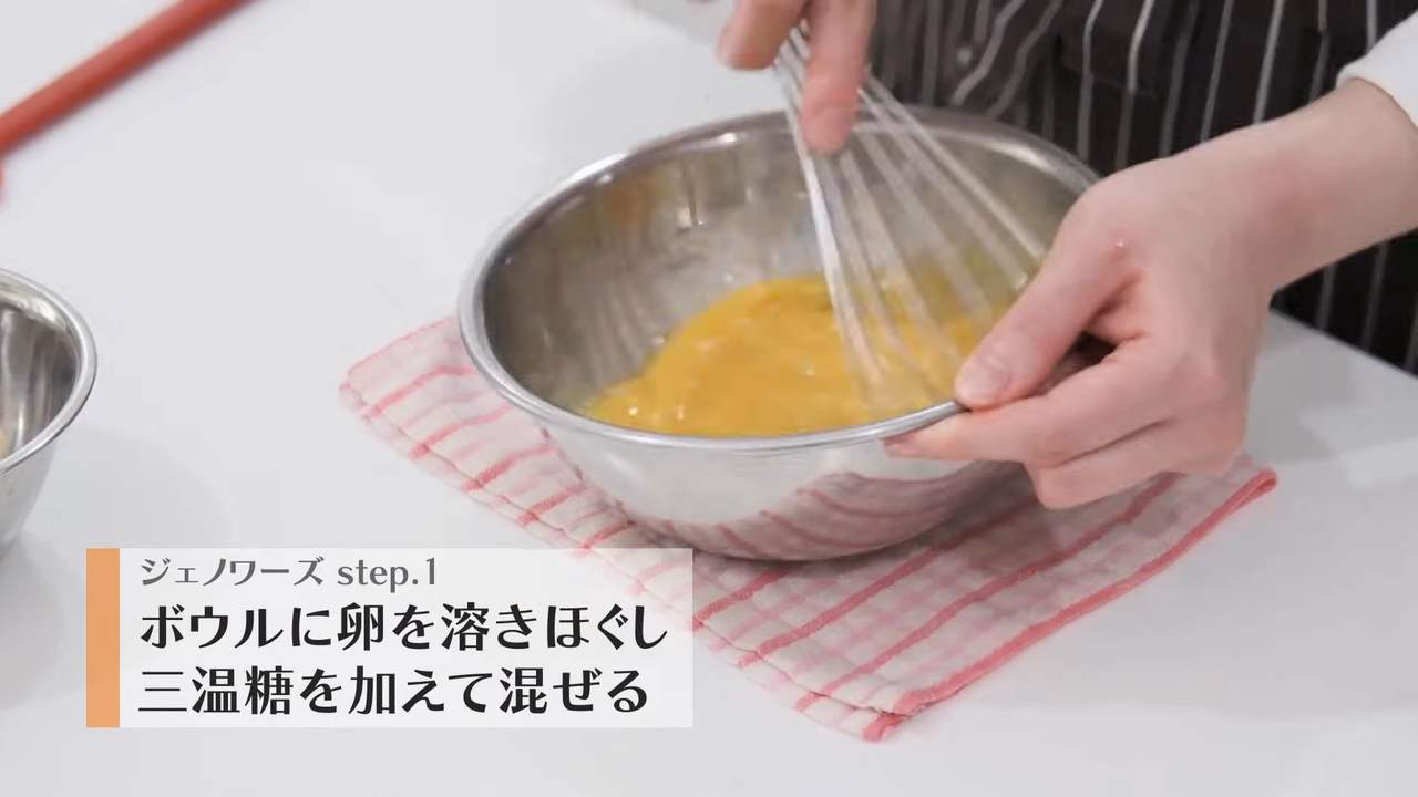 ボウルに卵を溶きほぐし、上白糖を加えて混ぜる。- 2