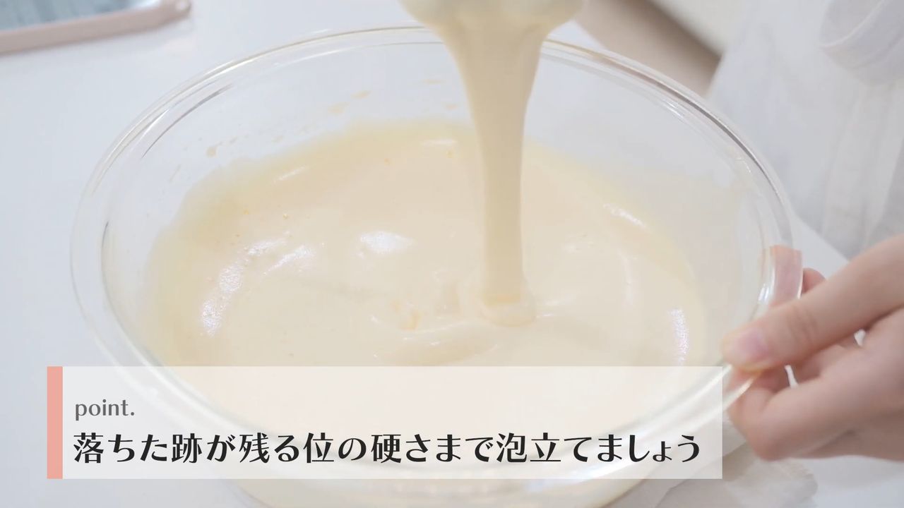 ボウルに卵を入れて、砂糖を2回に分けて加えながらもったりするまで攪拌する。