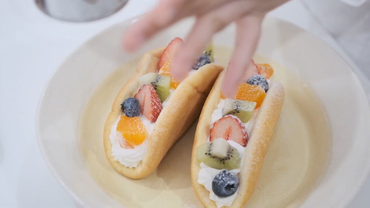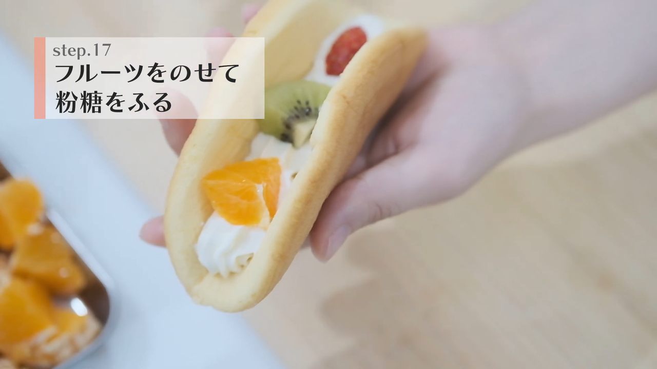 ボウルに生クリームと練乳を入れて泡立て、星の口金を付けた絞り袋に入れる。半分に折った生地の中にクリームを絞り、フルーツをのせる。- 2
