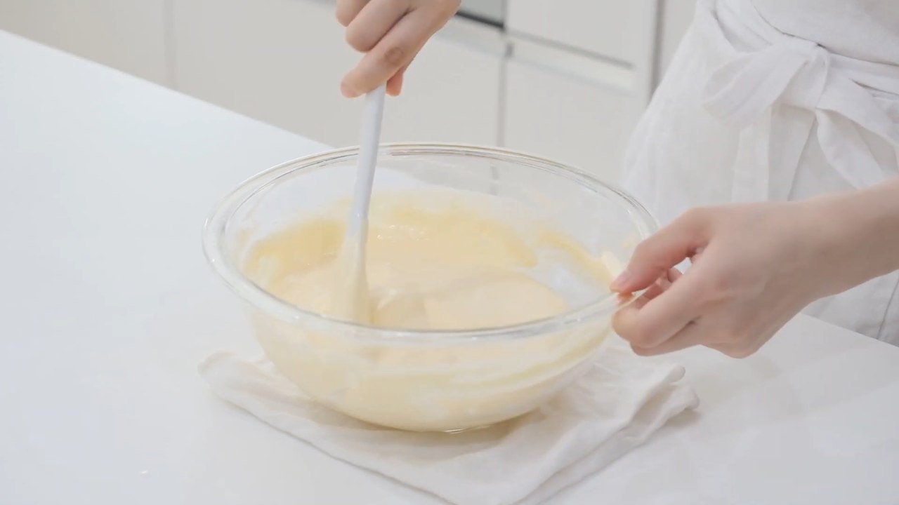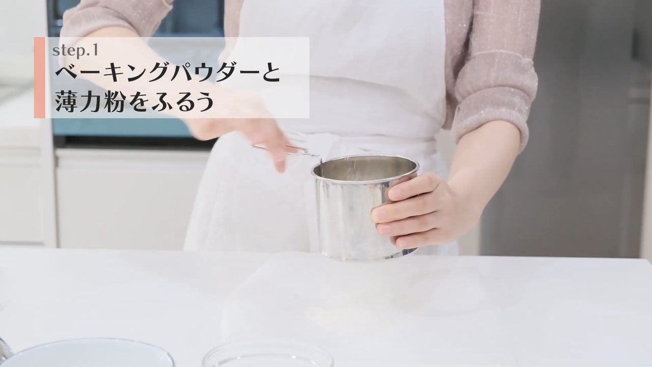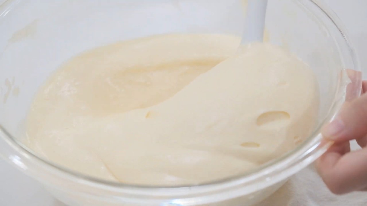 ふるったベーキングパウダーと薄力粉を加えて混ぜる。- 3