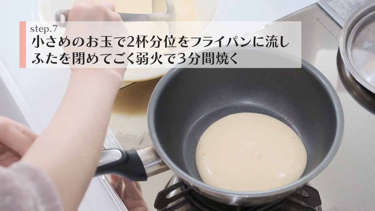小さめのお玉で2杯分位をフライパンに流し、ふたを閉めてごく弱火で3分間焼く。- 3
