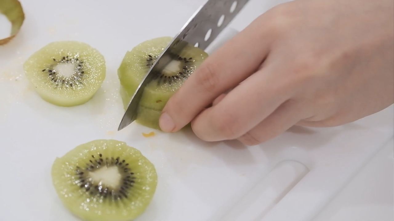 キウイは芯を取り除いて皮をむき、扇形にカットする。- 3