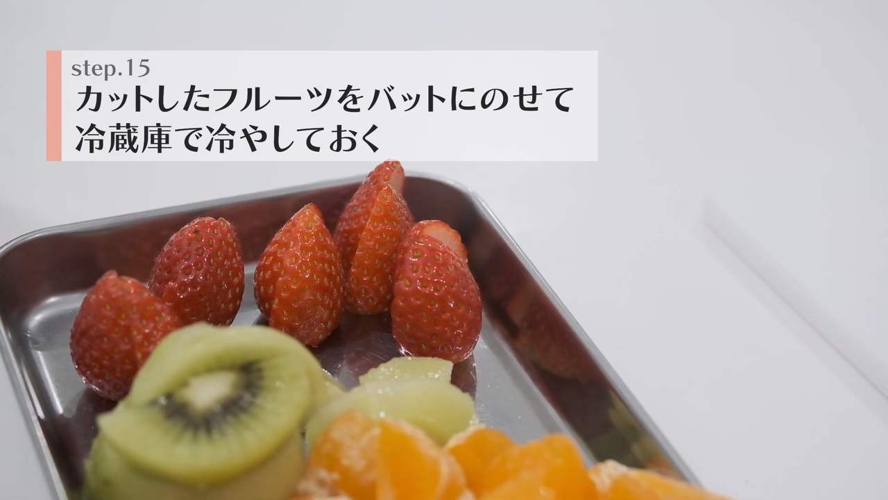 カットしたフルーツをバットにのせて冷蔵庫で冷やしておく。