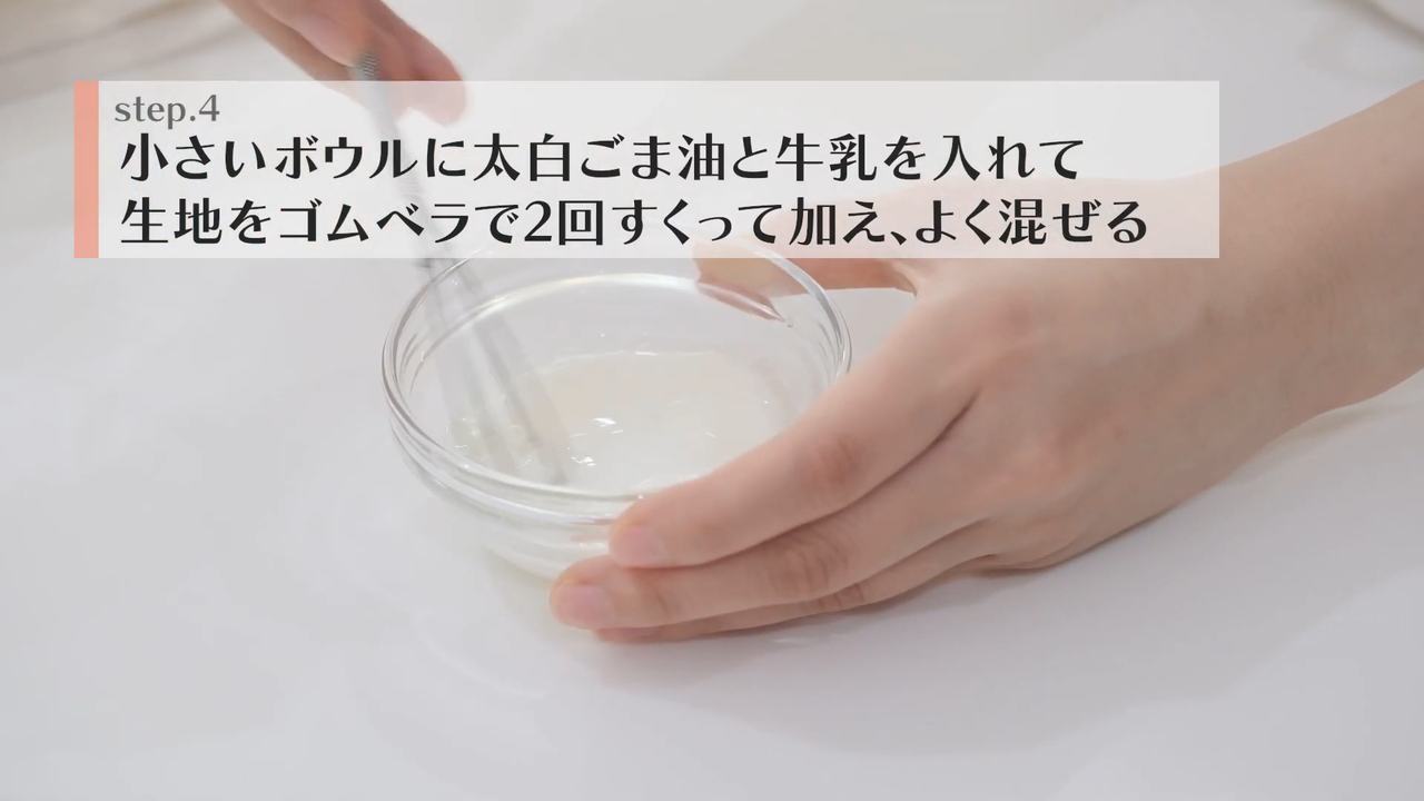 小さいボウルに太白ごま油と牛乳を入れて混ぜる。