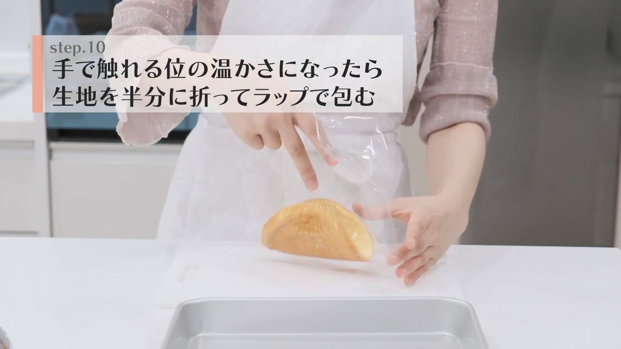 手で触れる位の温かさになったら、生地を半分に折ってラップで包む。- 6