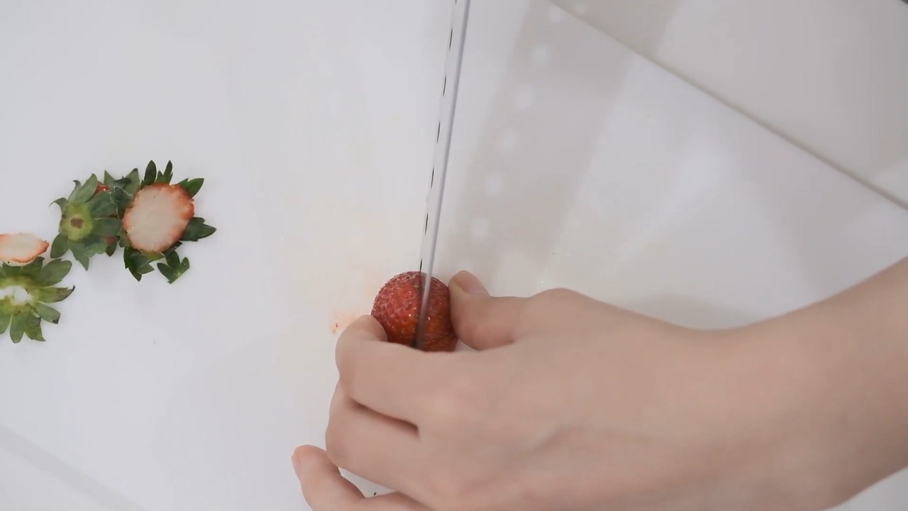 いちごはヘタを取って2等分にカットする。ブルーベリーは粒のまま使用する。- 4