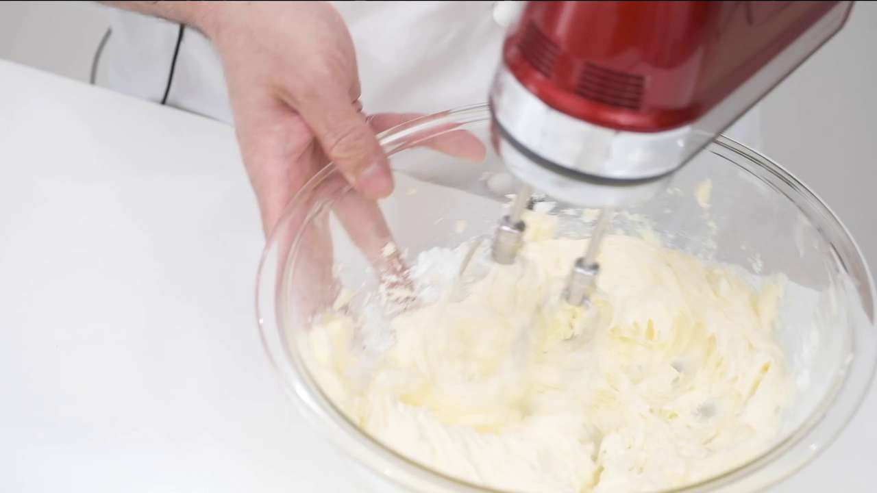 ボウルにバター、粉糖、塩を入れ、白っぽくなるまで泡立てる。- 2
