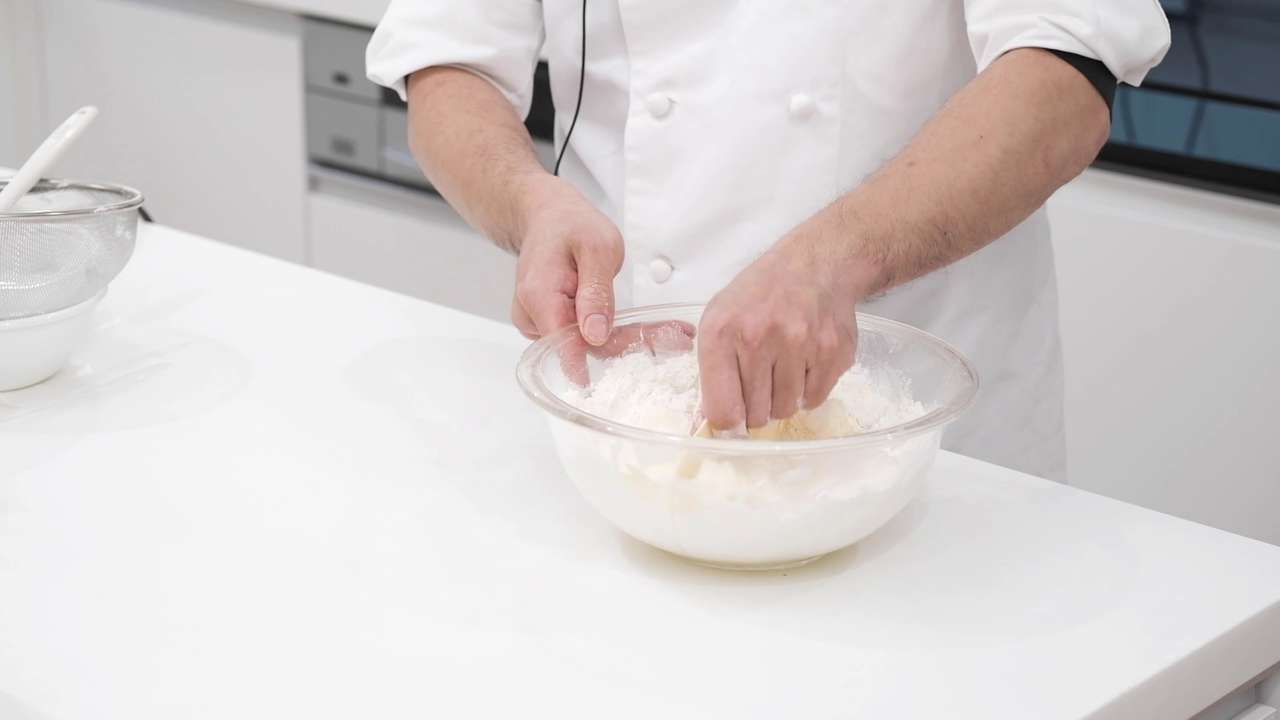 薄力粉、アーモンドパウダー、ベーキングパウダーを合わせてふるう。ラム酒を入れたボウルに加えてカードでさっくり混ぜる。- 5