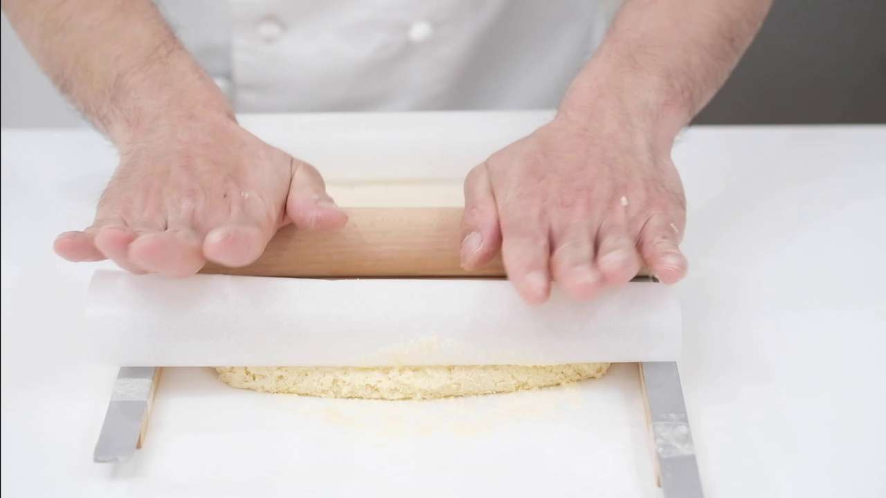 クッキングシートの上に生地を置いて、もう1枚のクッキングシートではさんで約1cm厚に伸ばす。- 6