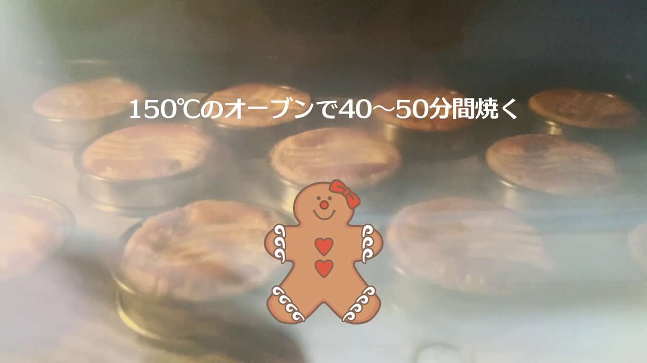 内側にバターを塗った直径6cmの型をはめて、150℃のオーブンで40~50分間焼く。