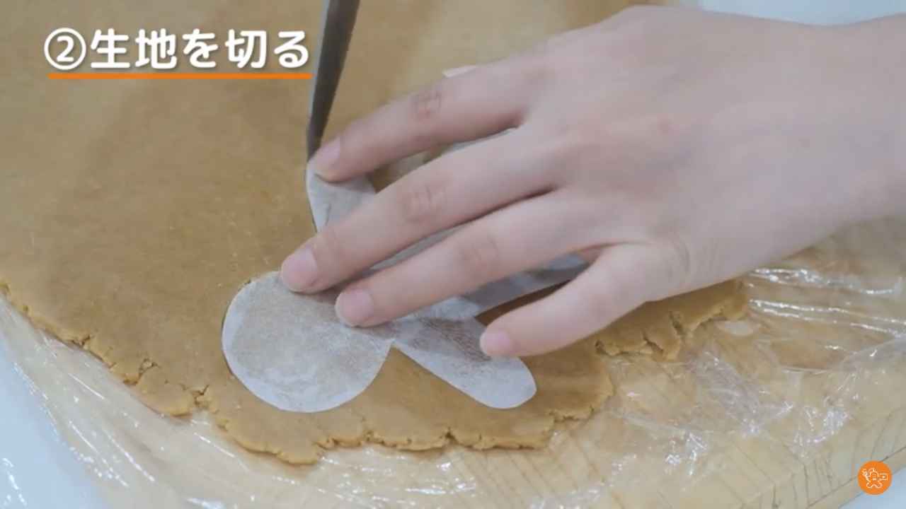 ジンジャーブレッドマンの型紙を置いてナイフでカットする。- 3